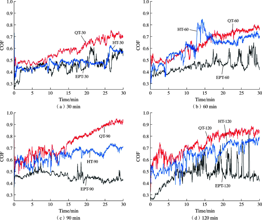 30,60,90,120 min的不同时间段脉冲电流处理的摩擦系数变化
