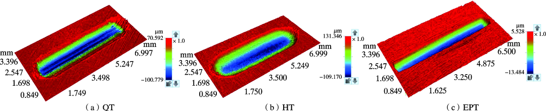 EPT试样的摩擦系数几乎全时间段均低于QT和HT,随着时间的延长摩擦系数增长幅度也小于HT和QT的。相较于HT和QT的磨痕体积,EPT试样的磨痕体积分别降低了91.98%、87.22%。
