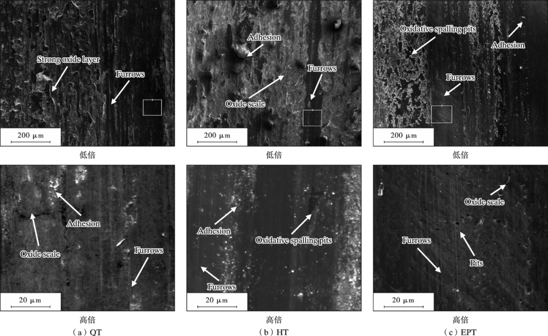EPT试样的磨损形式以磨粒磨损和氧化磨损为主,存在相对少的黏着磨损;QT和HT试样的磨损形式以黏着磨损和氧化磨损为主,存在少量的磨粒磨损。QT和HT试样的氧化膜较多褶皱,可见明显的擦伤痕迹,EPT试样的氧化膜较为平整。