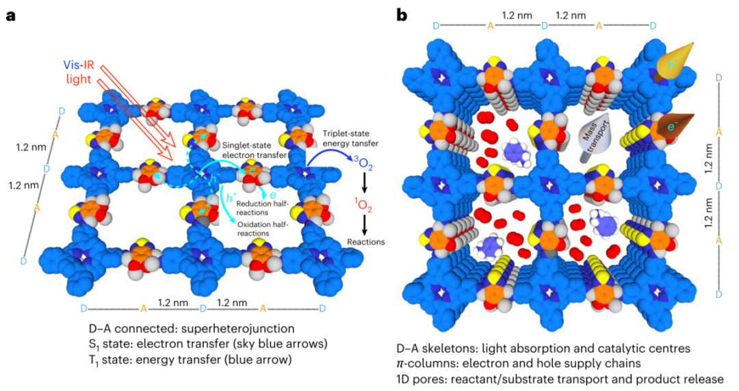 图2 | D–A框架光催化剂的催化过程。a,H2P-BT(OMe)2-COF的重构单层结构。每个给体(D,蓝色)与四个受体(A,橙色)相连,每个受体沿x和y方向以1.2纳米的规则间隔与两个给体相连。天蓝色箭头表示S1状态下的光诱导电子转移,形成氧化和还原单元,这些单元作为氧化和还原中心,以促进光催化作用。较深的蓝色箭头表示从T1状态下的能量转移,以激活反应物并促进反应。Vis-IR,可见-红外;3O2,三重态氧。b. 重构堆叠层结构(五层):卟啉给体柱传输空穴,苯并噻二唑受体柱传输电子,有序一维孔道为反应物供给与产物释放提供通道(仅展示O₂与苄胺)。