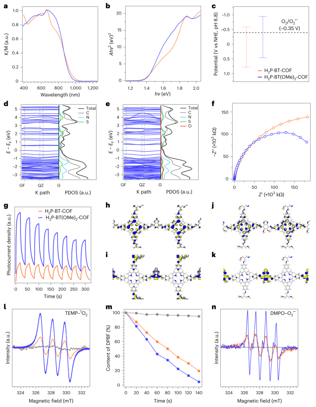 图5 | 光物理性质与反应中间体 a,b. H₂P-BT-COF(橙色)和H₂P-BT(OMe)₂-COF(蓝色)的固态电子吸收光谱(a)及对应Tauc图(b)。K/M:归一化Kubelka-Munk函数。 c. D-A COFs实验能级与氧还原电位对比(黑色虚线:-0.35 V)。 d,e. H₂P-BT-COF(d)和H₂P-BT(OMe)₂-COF(e)的能带结构(左)与投影态密度(PDOS,右)。 f. H₂P-BT-COF(橙色)和H₂P-BT(OMe)₂-COF(蓝色)的电化学阻抗谱。 g. 光电流密度随时间变化曲线。 h–k. H₂P-BT-COF(h,i)和H₂P-BT(OMe)₂-COF(j,k)的HOMO(h,j)与LUMO(i,k)轨道(蓝/黄色区域:轨道波函数相位)。 l. COFs在暗态(灰色)与红光(λ=620 nm)照射3分钟(含TEMP)的EPR谱图。 m. DPBF(40 μM)在无光催化剂(灰色)和有H₂P-BT(OMe)₂-COF(10 μg/ml,蓝色)/H₂P-BT-COF(10 μg/ml,橙色)条件下的降解曲线。 n. COFs在暗态(灰色)与红光照射3分钟(含DMPO)的EPR谱图。