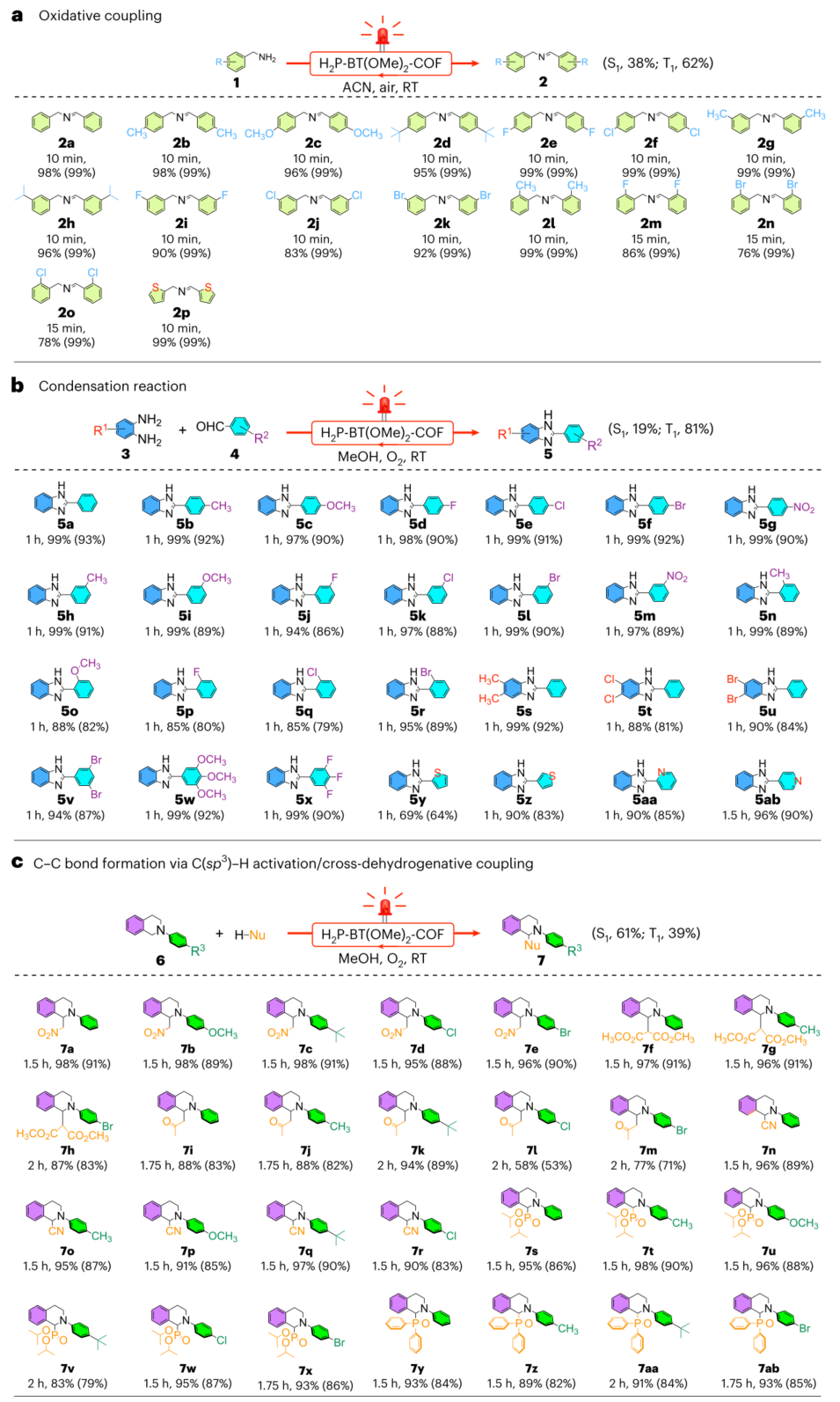 图6 | 光催化H₂P-BT(OMe)₂-COF的偶联与缩合反应 a. 氧化偶联反应(转化率经GC-MS测定,括号内为选择性),620 nm LED红光照射。ACN:乙腈;RT:室温。 b. 缩合反应(转化率经¹H NMR测定,括号内为分离产率),620 nm LED照射。 c. 通过C(sp³)-H活化/交叉脱氢偶联的C-C键形成反应(转化率经¹H NMR测定,括号内为分离产率),620 nm LED照射。Nu:亲核试剂。a–c图中右侧百分比为S₁与T₁态对反应的贡献率。
