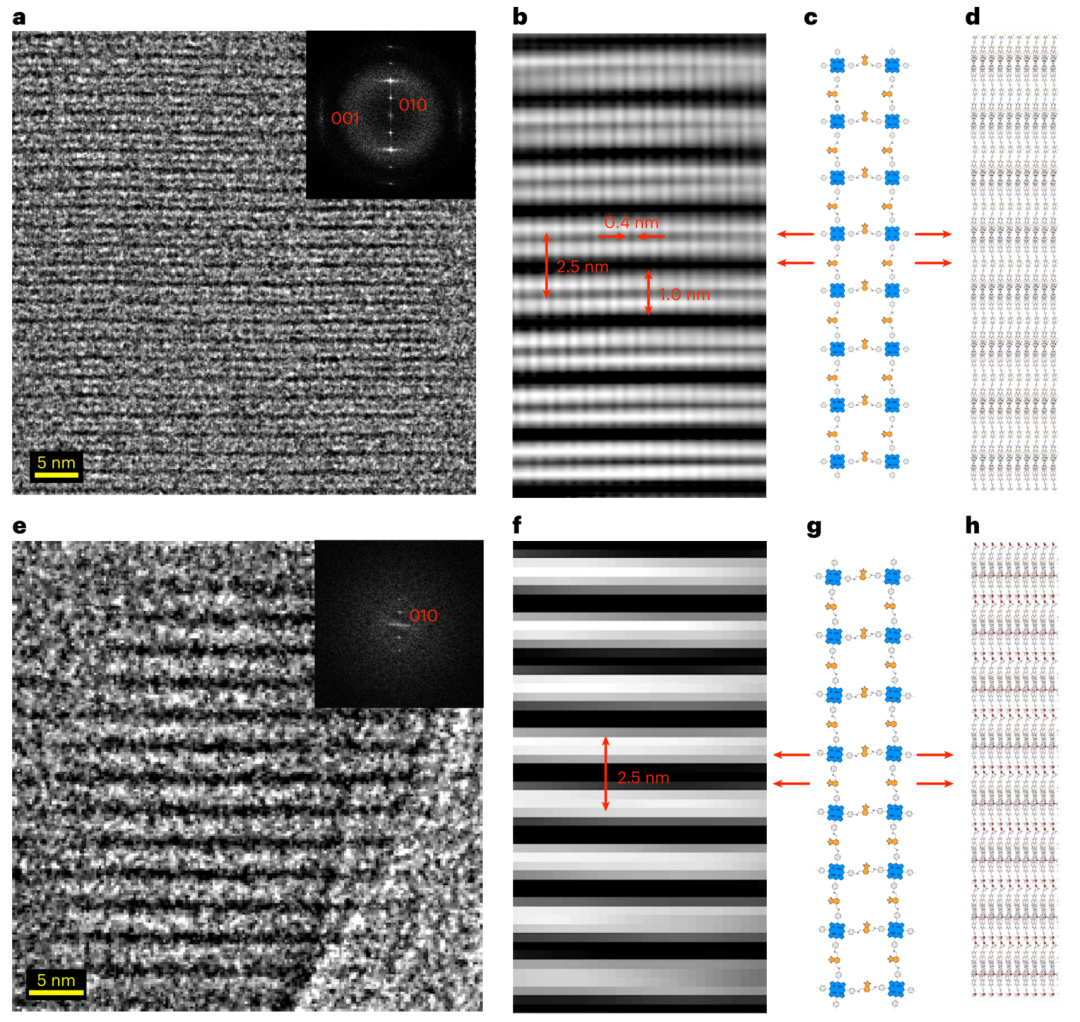 图4 | 高分辨透射电镜(HR-TEM)分析 a–d. H₂P-BT-COF分析:HR-TEM图像(a,插图为FFT图像);IFFT图像(b);有序一维孔结构(c,俯视);堆叠层结构(d,侧视)。 e–h. H₂P-BT(OMe)₂-COF分析:HR-TEM图像(e,插图为FFT图像);IFFT图像(f);有序一维孔结构(g,俯视);堆叠层结构(h,侧视)。c,g图中红箭头指示分子单元位置。