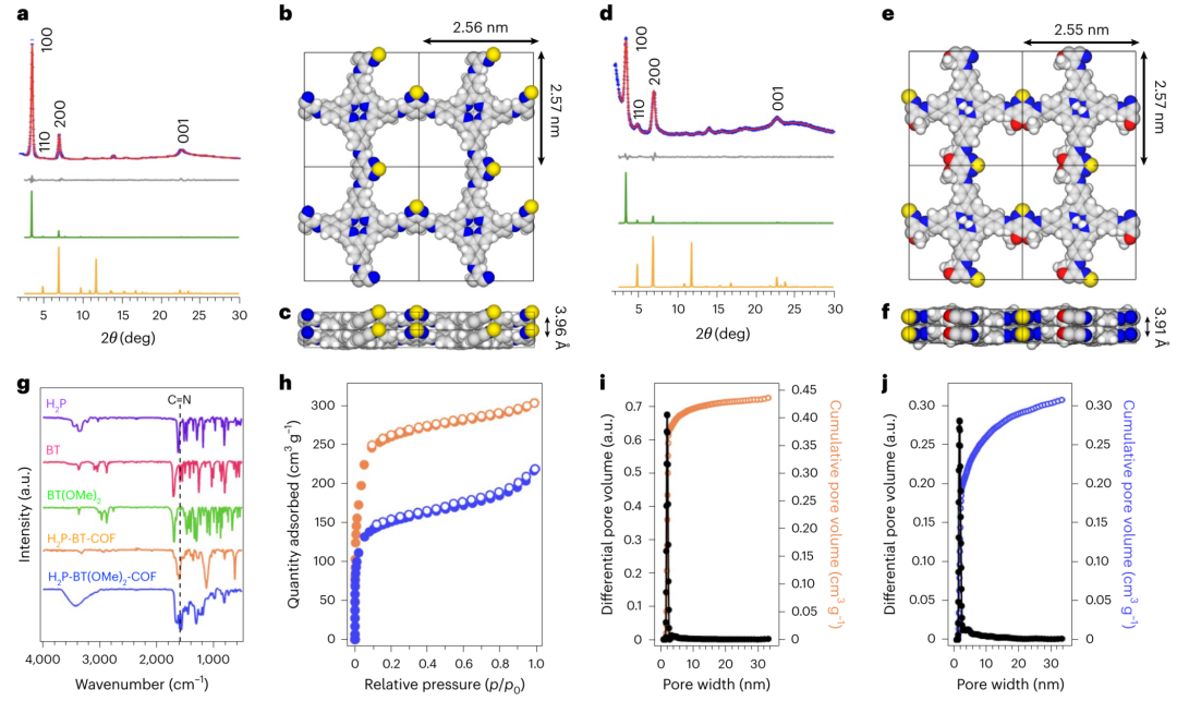 图3 | 晶体与多孔结构 a,d. H₂P-BT-COF(a)和H₂P-BT(OMe)₂-COF(d)的PXRD图谱(蓝十字:实验数据;红线:Pawley精修;灰线:差值;绿线:AA堆叠模拟;橙线:AB堆叠模拟)。 b,e. H₂P-BT-COF(b)和H₂P-BT(OMe)₂-COF(e)晶胞俯视图。 c,f. H₂P-BT-COF(c)和H₂P-BT(OMe)₂-COF(f)晶胞侧视图。 g. COFs与单体的FTIR光谱。 h. COFs的氮气吸附等温线(实心圆:吸附;空心圆:脱附;橙色:H₂P-BT-COF;蓝色:H₂P-BT(OMe)₂-COF)。 i,j. H₂P-BT-COF(i)和H₂P-BT(OMe)₂-COF(j)的累积孔体积(空心圆)与孔径分布(实心圆)。