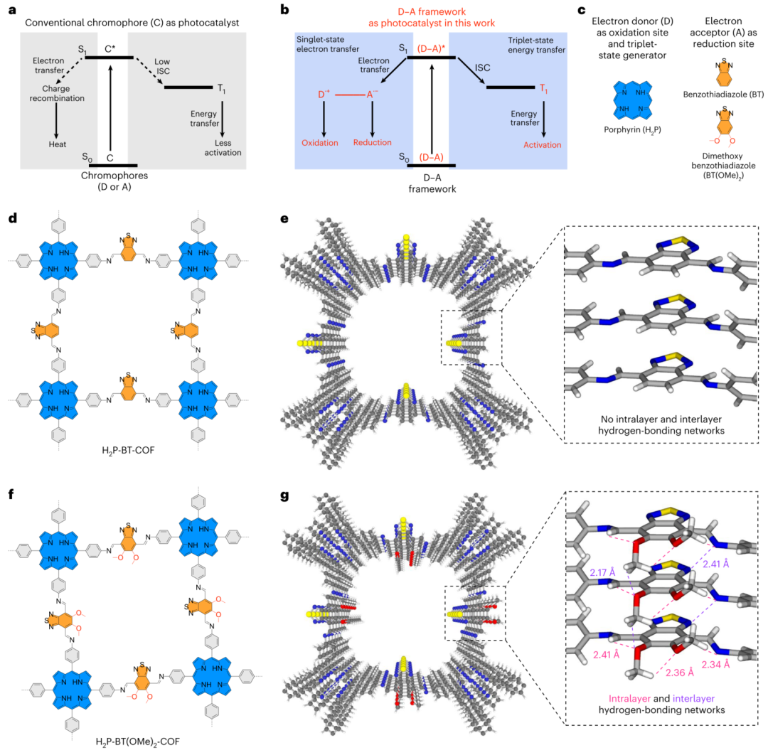 图1 | 光激发态与D-A框架光催化剂 a. 基于常规发色团光催化剂通过S₁或T₁态的光激发态与催化途径(星号表示激发态)。ISC:系间窜越。 b. D-A框架光催化剂中S₁与T₁双通道催化的光激发态。 c. 卟啉作为电子给体(D)、T₁态发生器及氧化位点,苯并噻二唑/二甲氧基苯并噻二唑作为受体(A)及还原位点的结构。 d,e. H₂P-BT-COF的化学结构(d)和重构晶体结构(e)(蓝色卟啉:给体;橙色苯并噻二唑:受体)。e图插图为无氢键存在区域。 f,g. H₂P-BT(OMe)₂-COF的化学结构(f)和重构晶体结构(g)。g图插图为发育完善的层内与层间氢键网络(紫色虚线:层间C-H···O/N氢键,2.17–2.41 Å;粉色虚线:层内C-H···O/N氢键,2.34–2.41 Å)。