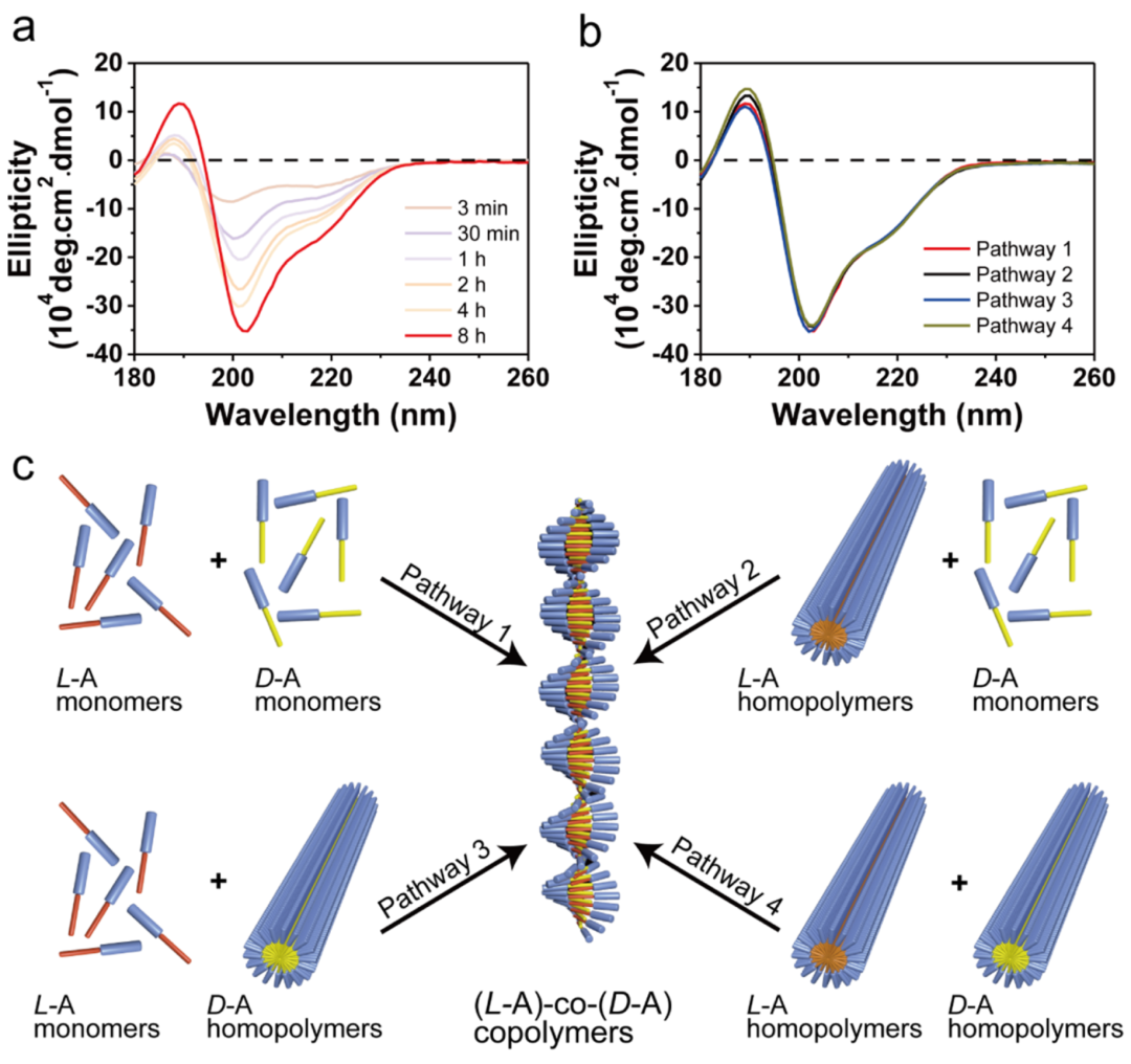 图3. 交替超分子共聚物的动力学研究及路径 (a) 通过途径 1 制备的 (L-A)-co-(D-A) 共聚物的时间分辨 CD 光谱。 (b) 四种不同路径制备的共聚物在热力学平衡下的 CD 光谱对比。 (c) 四种共聚物制备路径示意图: 途径 1:新鲜溶解的 L-A 与 D-A 单体混合;途径 2:新鲜 D-A 单体加入预组装的 L-A 均聚物;途径 3:新鲜 L-A 单体加入预组装的 D-A 均聚物;途径 4:预组装的 L-A 与 D-A 均聚物混合。
