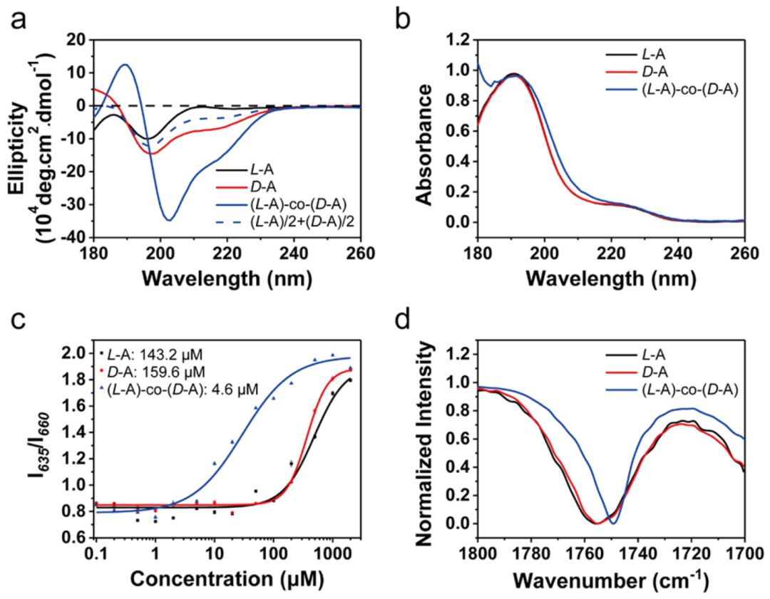 图2. 超分子共聚物的光谱学与稳定性研究 (a) L-A、D-A 均聚物及 (L-A)-co-(D-A) 共聚物的圆二色谱(CD)。虚线为均聚物光谱叠加结果。 (b) 紫外-可见吸收光谱。 (c) 通过尼罗红荧光探针法测定的临界胶束浓度(CMC)曲线。 (d) 均聚物与共聚物的傅里叶变换红外光谱(FTIR)羰基伸缩振动区(1800–1700 cm⁻¹)。