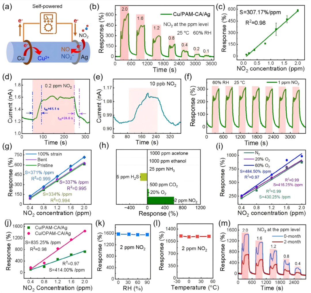 图2 自供电柔性NO₂传感器的传感性能 a) Cu/PAM-CA/Ag器件结构示意图。 b) Cu/PAM-CA/Ag对0.1–2 ppm NO₂的动态响应曲线。 c) 实验数据与线性拟合的响应值-NO₂浓度关系。 d) Cu/PAM-CA/Ag对0.2 ppm NO₂的响应/恢复时间分析。 e) Cu/PAM-CA/Ag对10 ppb NO₂的动态电流变化曲线。 f) 传感器对1 ppm NO₂的重复响应曲线。 g) 不同机械形变(原始、弯曲、100%拉伸应变)下Cu/PAM-CA/Ag的响应-NO₂浓度曲线。 h) Cu/PAM-CA/Ag对2 ppm NO₂与干扰气体(1000 ppm丙酮、1000 ppm乙醇、25 ppm NH₃、5 ppm H₂S、500 ppm CO₂、20% O₂)的响应对比。 i) N₂、20%和60% O₂环境中Cu/PAM-CA/Ag的响应-NO₂浓度曲线。 j) Cu/PAM-CA/Ag与Cu/OPAM-CA/Ag的响应-NO₂浓度曲线对比。 k) Cu/OPAM-CA/Ag在不同湿度下对2 ppm NO₂的响应对比。 l) Cu/OPAM-CA/Ag在不同温度下对2 ppm NO₂的响应对比。 m) Cu/OPAM-CA/Ag放置2个月前后对0.4–2 ppm NO₂的动态响应曲线。