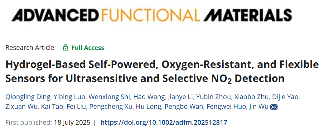 中山大学吴进教授团队提出一种基于致密聚丙烯酰胺-海藻酸钙(PAM-CA)水凝胶和异质金属电极对(铜-银)的自供电、抗氧干扰柔性NO₂传感器。该传感器利用微小电动势(0.11 V)选择性驱动NO₂还原反应,实现超高灵敏度(307.17%/ppm)、超低检测限(2.86 ppb)及优异抗氧性(在0%、20%、60%氧气环境下性能稳定)。通过在水凝胶中引入甘油形成有机水凝胶(OPAM-CA),器件环境耐受性进一步提升,可在-20°C至50°C及不同湿度下稳定工作。结合无线传感系统,该传感器成功应用于有氧/无氧环境中的痕量NO₂泄漏实时报警。