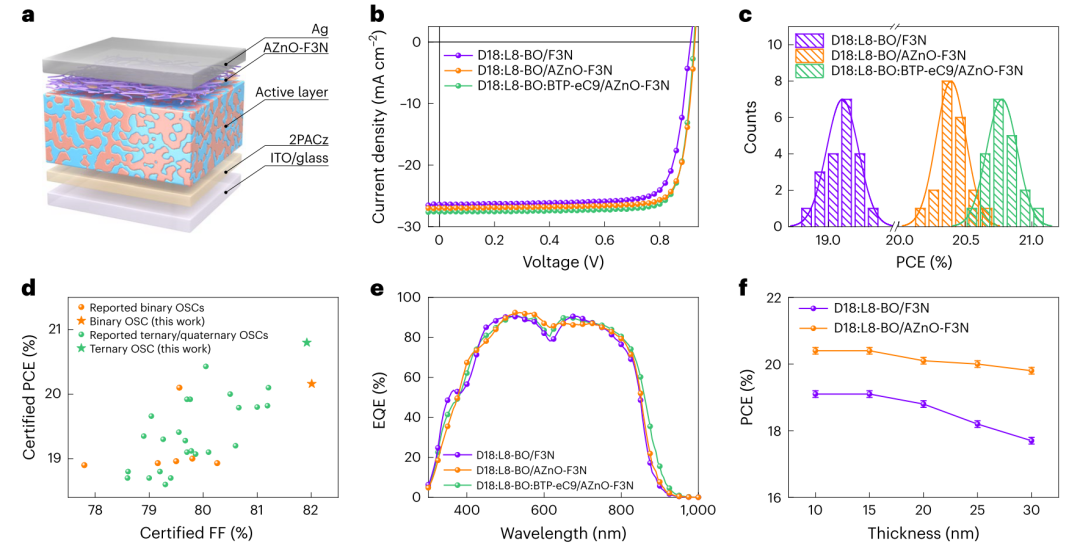 图4:光伏性能 a. AZnO-F3N基OSCs的器件结构 b. 以F3N和AZnO-F3N为CIL的D18:L8-BO基器件,以及以AZnO-F3N为CIL的D18:L8-BO:BTP-eC9基器件的J-V曲线 c. 基于F3N和AZnO-F3N CIL的20个器件的PCE统计直方图 d. 文献报道的高效OSCs认证PCE与认证FF关系图(详参附表5)
