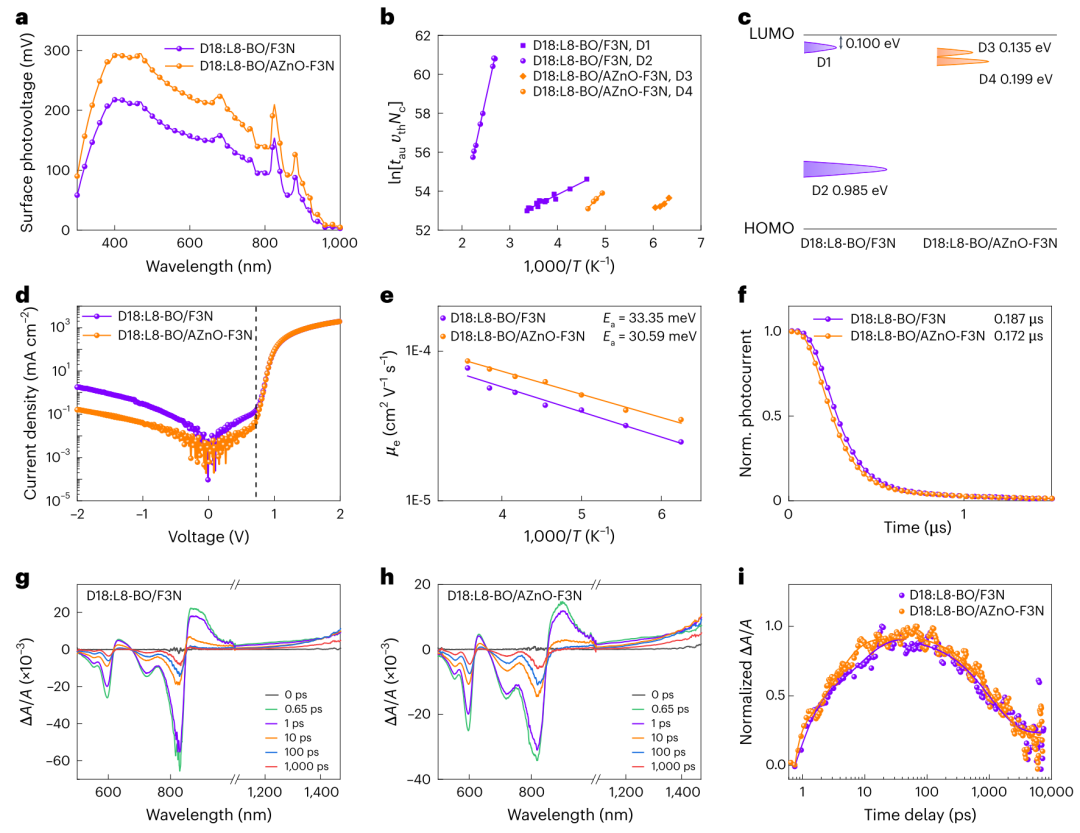 图5:器件物理与超快过程表征 a. D18:L8-BO/F3N和D18:L8-BO/AZnO-F3N共混薄膜的表面光电压(SPV) b. 基于深能级瞬态谱信号(经离散拉普拉斯变换处理)的陷阱态阿伦尼乌斯图(τ:发射时间常数;υth:热速度;NC:电子有效态密度) c. 带隙中深能级陷阱示意图(峰位/高度对应陷阱深度/密度;HOMO:最高占据分子轨道;LUMO:最低未占分子轨道) d-f. 暗态J-V曲线(d)、温度依赖空间电荷限制电流法测得的电子迁移率(e)及电荷提取曲线(f)(Norm.:归一化) g,h. 400 nm激发下D18:L8-BO/F3N(g)和D18:L8-BO/AZnO-F3N(h)共混薄膜在指定延迟时间的瞬态吸收光谱 i. 1,400 nm处探测的激子衰减动力学(各样品中900 nm处单线态动力学信号已扣除)