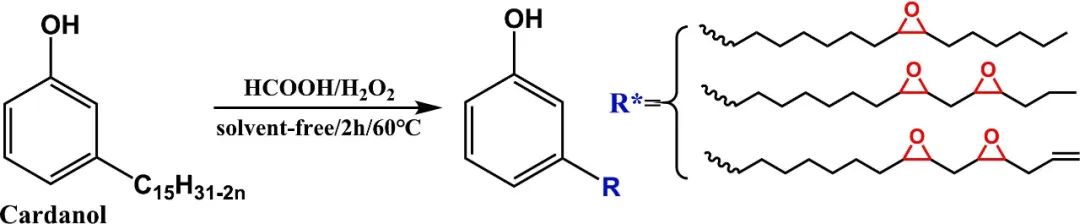 以水性腰果酚基环氧树脂为原料,磺化还原氧化石墨烯(SG)为纳米填料,通过相转化乳化工艺制得水性生物基环氧防腐涂层。 结果表明,含0.5wt%SG的涂层在机械性能和耐腐蚀性方面优于其他配方。当SG含量为0.5wt%时,涂层的低频阻抗(|Z|0.01Hz)达到2.96×109Ω·cm2,比未改性的涂层高一个数量级。经过720小时的电化学阻抗谱(EIS)测试后,该涂层的阻抗仍保持在这一高水平。此外,在360小时的划痕盐雾试验中,该涂层表现出最不明显的腐蚀扩展,表现出优异的防腐性能。因此,本研究为开发高性能、环保型防腐涂层提供了新颖的设计思路和技术途径,也为农业废弃物的高价值利用开辟了一条潜在的途径。 腰果酚环氧化反应机理 腰果酚环氧化反应机理。