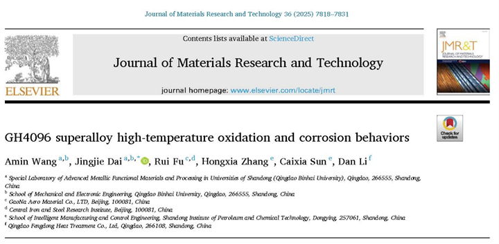 相关成果“GH4096 superalloy high temperature oxidation and hot corrosion behaviors”(《GH4096镍基合金的高温氧化和腐蚀行为研究》)发表在Journal of Materials Research and Technology(中科院SCI二区,2023—2024年影响因子6.2)。王阿敏老师为第一作者,戴景杰教授为通讯作者,青岛滨海学院为第一作者和通讯作者单位,山东石油化工学院、北京钢研高纳科技股份有限公司、青岛丰东热处理有限公司为联合完成单位。