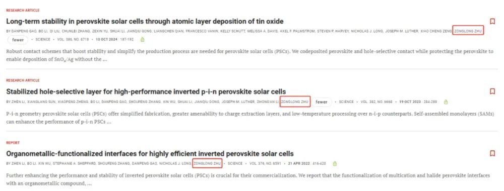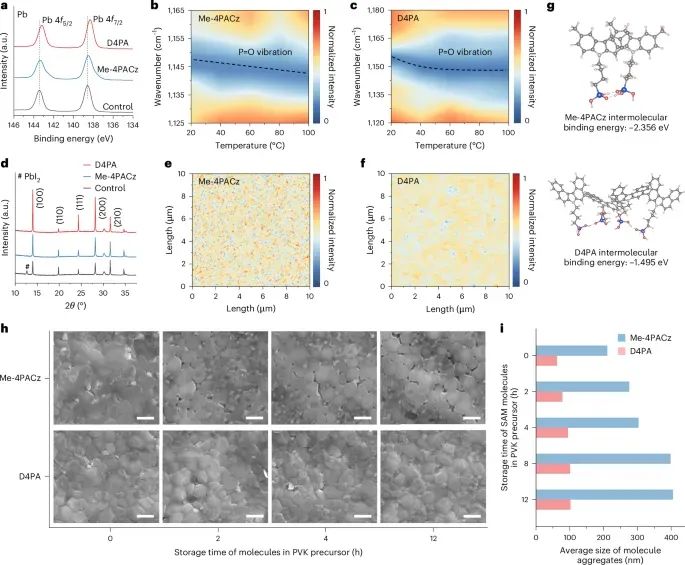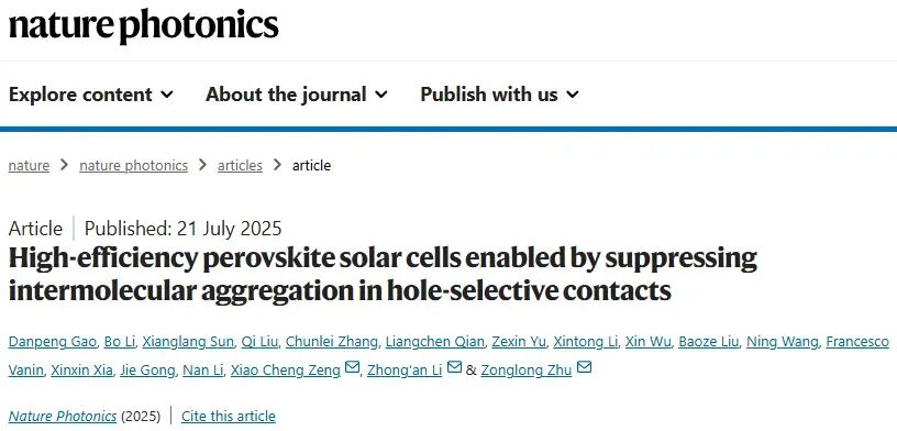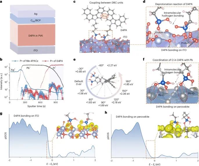 金属卤化物钙钛矿因卓越的光电特性而迅速提升了太阳能电池效率,但要逼近 Shockley–Queisser 极限仍受限于空穴选择性层(HSL)的均匀沉积与分子聚集问题。传统小分子 HSL(如 Me‑4PACz)在溶液工艺中易聚集,导致器件效率、可重复性与稳定性下降。行业急需能够在保持高黏附性的同时抑制分子团聚的新型有机空穴材料,以实现可规模化生产的高效钙钛矿电池。鉴于此,香港城市大学朱宗龙教授, 华中科技大学李忠安教授,香港城市大学曾晓成教授联合报道通过在钙钛矿成膜过程中协同沉积一种新型 p 型小分子 D4PA,其分子内 C–C 耦合不仅提供双位点锚定以强化界面电荷传输和缺陷钝化,还通过构象扭曲与位阻效应有效阻止分子聚集。小面积器件获得 26.72% 认证效率,10.86cm² 迷你组件亦达到 23.37% 效率;在最大功率点连续工作 2500h 后仍保持 97.2% 初始效率,展示了商业化连续工艺的可行性。相关研究成果以题为“High-efficiency perovskite solar cells enabled by suppressing intermolecular aggregation in hole-selective contacts”发表在最新一期《nature photonics》上。值得一提的是,这是朱宗龙教授自2022年以来,已发表三篇《Science》后,再发《nature photonics》。作者首先给出了 ITO/D4PA钙钛矿/C₆₀/BCP/Ag 反向结构示意(图1a);TOFSIMS 深剖表明 D4PA 由界面向体相均匀分布(图1b)。密度泛函计算显示,图1c、1d 中 D4PA 的双磷酸锚基在 ITO (111) 面形成 P–O–In 键长 2.29Å、结合能 −4.42eV,而在钙钛矿表面(图1f)则与 Pb²⁺ 协调。图1e 的半旋转能差证明分子内氢键仅在旋转角 <30° 时稳定,确保构象锁定并提供位阻。pDOS 分析(图1g、1h)显示磷氧对价带最大值有显著贡献,说明 2T 锚定促进界面电荷转移。整体来看,D4PA 同时实现了强黏附与防聚集双重功能。XPS(图2a)中 Pb 4f 峰向低束缚能移动表明 D4PA钙钛矿相互作用更强;温度依赖 FTIR(图2b、2c)显示 D4PA 的 P=O 振动在低温已完成红移,证明晶粒早期即形成稳定键合。XRD(图2d)峰强增强及峰面红外成像(图2e、2f)共同揭示 D4PA 促进膜内均匀分散并提高结晶度。DFT 计算(图2g)给出 D4PA 分子间结合能 −1.495eV,远弱于 Me4PACz 的 −2.356eV;DLS 结果(图2i)证实 12h 储存后前者颗粒仅由 62nm 增至 102nm,而后者从 211nm 增至 405nm,进一步印证位阻效应抑制聚集,为连续工艺延长“可加工窗口”。在 0.0412cm² 器件上,图3a 的 J–V 曲线显示 D4PA 反扫效率 26.83%,较 Me4PACz 提升 1.86pct;图3b 的认证曲线确认 PCE 为 26.72%,对应 VOC=1.197V、JSC=26.21mAcm⁻²、FF=85.17%。稳态功率跟踪(图3c)在 300s 内保持 26.14% 效率。图3f 进一步显示不同储存时间下 D4PA 墨水制备的器件效率仅下降 0.32%,而 Me4PACz 下降 1.81%,验证其工业友好性。刀片涂布的 10.86cm² 迷你组件(图3g、3h)实现 23.37% PCE 与 22.66% 认证 MPPT 效率;长期稳定性测试(图3i)中,D4PA 设备在空气中 1sun MPP 持续 2500h 后仍维持 97.2% 初始性能,优于对照组的 82.7%。激发光从 ITO 侧进入时,D4PA 薄膜的 PL 分布(图4b)均匀且整体强度降低,TRPL(图4c)载流子寿命缩短,说明空穴提取更快更均一。tDOS(图4d)显示 0.4–0.5V 深能级陷阱密度显著下降;QFLS光强曲线(图4e)下 D4PA 膜始终高于 Me4PACz,配合 15.25% 的 EQE_EL(图4f)反映界面非辐射复合被抑制。DFT 进一步揭示 D4PA 双位点锚定对 VI、i_I 与 Pb_I 缺陷区域(图4g–4i)具有 −2.75至 −3.37eV 的低结合能,且缺陷诱导态被完全钝化,为高 VOC 与低能损奠定基础。总的来说,分子内 C–C 耦合赋予的构象锁定与多位点锚定使 D4PA 同时实现了界面黏附增强、缺陷钝化与分子去聚集三重优势,在小面积器件中创造 26.72% 认证效率,并首次通过一步沉积在 10.86cm² 组件上取得 23.37% 的 PCE 与 2500h 的 MPP 稳定性。该策略为开发高效、可连续制备且长寿命的 p–i–n 钙钛矿太阳能电池提供了新路线,也为未来工业级大面积生产奠定了材料与工艺基础。