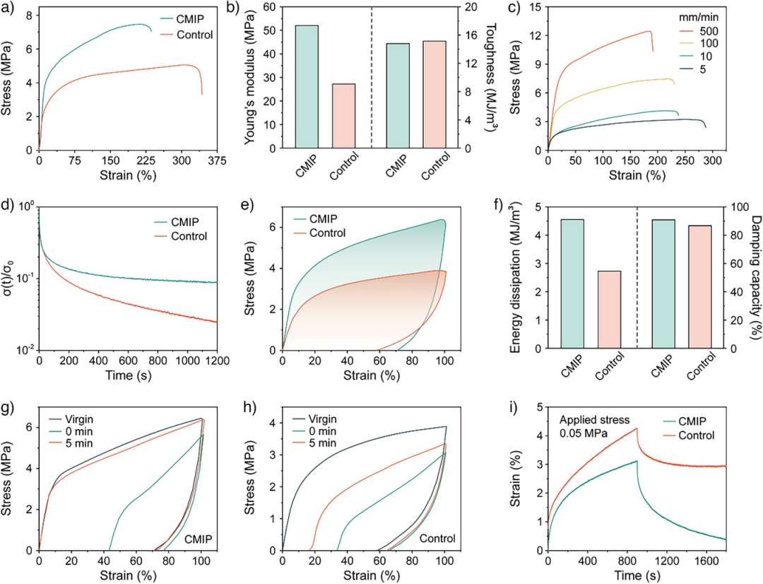 此外,作者利用循环拉伸-恢复与蠕变-恢复实验研究了CMIP的恢复性能。循环拉伸-恢复实验结果表明,CMIP连续拉伸后仅需5分钟即可几乎完全恢复初始状态(图3g),而Control恢复程度严重滞后(图3h)。蠕变-恢复实验同样证实CMIP具有更优的形变恢复能力(图3i)。这些性能差异是由于参比网络在应变下会发生主客体及网络结构的解离,且局部重新形成的主客体相互作用会延缓网络恢复至平衡态;反观CMIP,其中MIP在外力作用下的受限分子内运动不会破坏网络的结构完整性,再配合着CP弹性作用,两者协同促进其形变后的快速恢复。