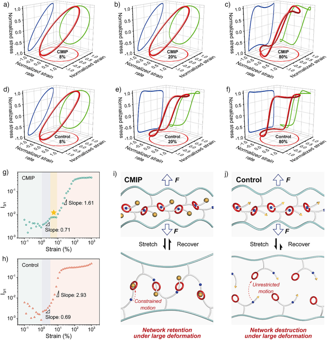 为进一步揭示CMIP的结构-性能关系,作者采用大振幅振荡剪切LAOS)实验展开深入研究。在不同应变下获得了一系列三维李萨如曲线(图4a-f)。这些曲线在应力-应变平面的投影构成弹性李萨如环(蓝色环),其越窄表明材料越接近理想弹性体;而在应力-应变速率平面的投影则形成黏性李萨如环(绿色环),其宽度反映材料与牛顿流体特性之间的偏离程度。在整个大应变范围内,CMIPControl的弹性/黏性李萨如环均呈现出显著差异。如图4ad所示,在8%应变下,CMIP的弹性环几乎无变形,而Control已出现轻微扭曲。随着应变增加至20%Control的李萨如环发生明显畸变,其弹性环由椭圆显著偏离为平行四边形,表明其屈服应力较低(图4e)。同时,其黏性环也出现明显扭曲,说明该应变下存在较强的耗散机制,可能源于主客体识别的解离以及随后的网络结构破坏。相比之下,CMIP20%应变下的李萨如环仅出现轻微形变(图4b),表明MIP的引入增强了网络在初始变形阶段的形变承受能力。当应变进一步增加至80%时,两个样品的李萨如环均表现出严重畸变,说明网络结构发生了显著变化(图4cf)。然而,CMIP环的畸变程度依然明显低于Control样品,进一步证明其网络结构更为稳定