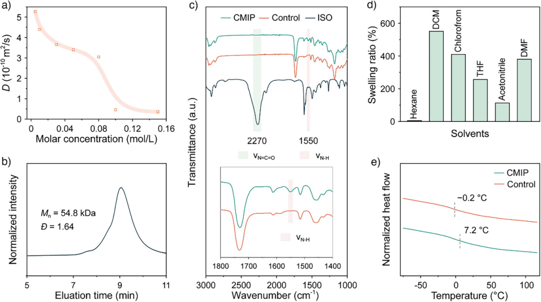 作者首先通过二维扩散有序谱DOSY)证实单体经主客体识别形成超分子聚合物(图2a),继而利用凝胶渗透色谱(GPC)验证了基于开环易位聚合ROMP)的共价聚合物成功合成(图2b)。至此,经两步聚合获得未互锁前驱体网络,将其作为参比体系(Control)用于后续对比研究。最终通过前驱体网络中羟基与小分子异氰酸酯封端剂的高效反应实现互锁:红外光谱中1550 cm-1处氨基甲酸酯特征峰的出现(图2c)及溶胀实验数据(图2d),共同确证了互锁网络的形成。