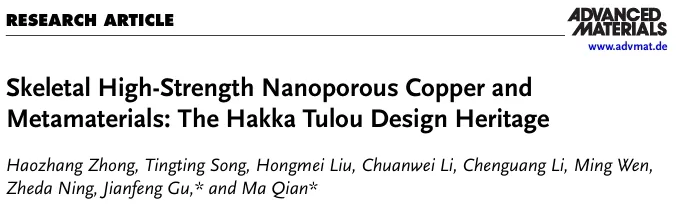 本研究由顾剑锋教授和Ma Qian教授共同指导,相关成果以《Skeletal High-Strength Nanoporous Copper and Beyond: The Hakka Tulou Design Heritage》为标题发表于Advanced Materials.