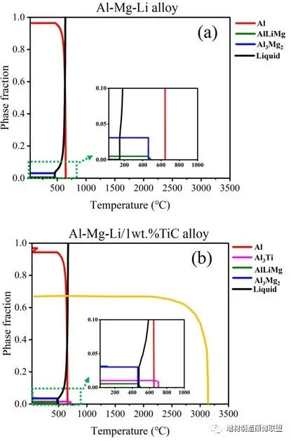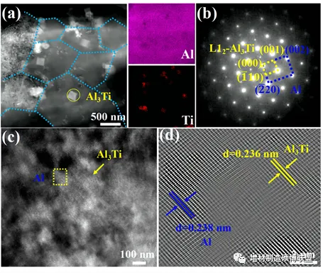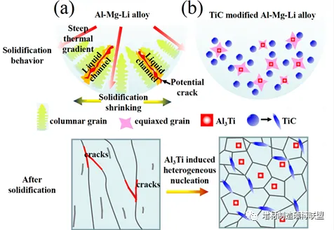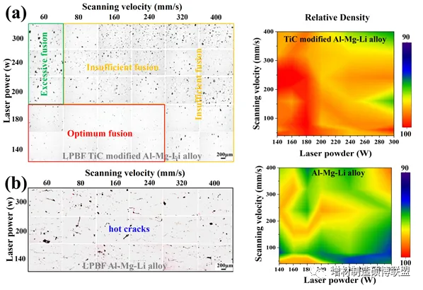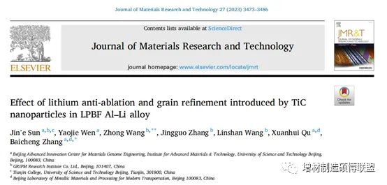 铝锂合金由于其低密度、良好的耐腐蚀性以及高强度和韧性的结合,在航空航天领域取得了成功的应用。常用的铝锂合金,包括2195、2050、2099和2199,主要通过铸造和锻造加工成薄片和试管。增材制造(AM)铝锂合金在制造仿生结构、晶格结构或其他复杂的功能/结构组件方面显示出巨大的潜力。然而,激光粉末床熔合(LPBF)加工的铝锂合金仍然面临挑战。高能束激光加工会导致铝锂合金产生严重热裂纹以及锂元素的烧蚀。 北京科技大学张百成副教授(通讯作者)等研究人员为了消除铝锂合金中的热裂纹,降低锂元素的烧损,开发了一种用于LPBF工艺的纳米陶瓷颗粒改性的新型铝锂合金。相关工作以 “Effect of lithium anti-ablation and grain refinement introduced by TiC nanoparticles in LPBF Al-Li alloy” 为题发表在《Journal of Materials Research and Technology》上。北京科技大学博士研究生孙金娥为论文第一作者,本工作获得北科大曲选辉教授指导。 熔体池中TiC纳米颗粒有效地提高了铝合金液体的粘度,减少了金属汽化和液体飞溅,从而防止了LBPF过程中Li元素烧蚀。Li含量从打印铝锂合金中的0.87 wt.%,显著提高到打印TiC改性铝锂合金中的1.34 wt. %。 此外,在铝锂合金凝固过程中,TiC纳米颗粒作为额外形核质点,促进了柱状晶向等轴晶的转化过程,极大的降低了材料热裂性,实现了全致密铝锂合金制备。在LPBF过程中,在TiC纳米颗粒表面发现了从TiC到Al3Ti的梯度转变反应,原位形成的Al3Ti相显著降低了与Al基体的晶格失配,从而使其具有优异的极限拉伸强度(343 MPa)和伸长率(9.3 %)。TiC纳米颗粒诱导的锂元素抗烧蚀作用为添加剂制造轻质合金提供了一条新的途径。本研究通过调控不同激光功率(140-10-300W)和扫描速度(60 - 400 mm/s)制备了TiC改性的Al-Mg-Li合金,图1 (a)显示了该合金的OM显微图。在扫描速度为320~400 mm/s,激光功率为200~300W时,以及扫描速度为80~400mm/s,激光功率为140~180W时合金中形成了不规则孔隙,这是由于较低的能量输入导致了不良的熔合。 此外,当扫描速度低于80mm/s,激光功率在200-300W范围内时,可以发现一些大的圆形孔隙,这些可见的冶金缺陷可以解释为过高的能量输入导致轻质元素如Al、Mg和Li的汽化。当激光功率在140~180W范围内,扫描速度在60~240 mm/s范围内时,打印TiC改性的Al-Mg-Li合金呈现几乎全致密状态,如图1 (a)中红色实线框所示。相反,打印的Al-Mg-Li合金在所有激光参数区域均形成了微小的热裂纹,如图1 (b)所示,这在LPBF打印的铝-铜合金中也发现了类似的现象。 此外,相应的相对密度结果表明,TiC改性的Al-Mg-Li合金的相对密度高于Al-Mg-Li合金。TiC改性Al-Mg-Li合金在60~240 mm/s扫描速度和140~180W激光功率下的高相对密度为99.6 %,而Al-Mg-Li合金应用工艺参数下的最高相对密度为96.1 %,这是由于严重的裂纹形成所致。因此,TiC改性Al-Mg-Li合金在宽工艺参数窗口下具有良好的LPBF打印性和有效的抗裂性。 图1 不同激光功率和扫描速度下制备的(a)合金和(b)TiC纳米颗粒改性Al-Mg-Li合金的光学显微图和相对密度 采用ICP-OES研究了相同激光加工参数(扫描速度为240mm/s,激光功率为140W)下不同状态Al-Mg-Li合金中Li元素的含量,如图2所示。结果表明,打印的TiC改性Al-Mg-Li合金的锂含量与原料粉相似。而打印的Al-Mg-Li合金中的锂含量显著降低到0.87wt.%。这是因为Li元素(342℃)的沸点比其他元素的沸点低很多,导致了高能激光束处理中Li的烧蚀。 显然,与Al-Mg-Li合金粉末和TiC改性Al-Mg-Li合金粉末中的锂含量(1.4wt.%)相比,TiC显著降低了Al-Mg-Li合金中Li的损失率,降低了56.5%,明显低于任何LPBF加工铝锂合金的研究。因此,纳米陶瓷颗粒改性是防止LPBF过程中锂元素损失的有效方法。 图2 Al-Mg-Li合金粉末、TiC纳米颗粒改性Al-Mg-Li合金粉末、LPBF打印Al-Mg-Li合金和TiC纳米颗粒改性Al-Mg-Li合金中的Li含量 选择240mm/s的LPBF扫描速度和140W激光功率下制备的Al-Mg-Li合金和TiC改性Al-Mg-Li合金试样进行扫描电镜和EBSD表征,典型的扫描电镜和EBSD微观结构特征如图3所示。如图3(a)所示,Al-Mg-Li合金呈现出LPBF打印铝合金的典型熔体池(MP)形态,即沿建筑方向(BD)的“扇形”形态。注意到,由于LPBF过程中热梯度与凝固速率的比值较高,MP内的微观结构均由粗长的柱状晶粒组成,如图3(b)所示。如图3 (c)所示,LPBF打印的Al-Mg-Li合金由具有<001>优先生长取向的柱状晶粒组成。此外,柱状晶间处可见热裂纹。 相反,TiC改性Al-Mg-Li合金的微观结构表现为随机取向的全等轴晶粒,如图3(d-f)所示。这表明TiC纳米颗粒的加入有效地消除了热裂纹。并对Al-Mg-Li合金的柱状向等轴晶粒转变起到了关键作用。 图3 LPBF打印的(a-c)Al-Mg-Li合金和(d-f)TiC纳米颗粒改性的Al-Mg-Li合金的扫描电镜图像和EBSD IPF图像 据统计,柱状晶粒的平均粒径为173±34µm(图4(a)),说明柱状晶粒在多层上沿BD外延生长(层厚设为30µm)。等轴晶粒的平均粒径约为1.5±0.9μm,比打印的Al-Mg-Li合金细化了两个数量级,如图4(b)所示。根据Liu等和Qu等的文献,在TiC纳米颗粒增强Al-Mg-Cu合金和6061合金中也发现了类似的晶粒细化现象,但这些合金的粒径在2.22μm~10.6μm之间,大于本研究中获得的1.5 μm的晶粒尺寸。这种期望的全等轴晶粒微观结构与Sc或Zr改性LPBF Al合金中发现的等轴/柱状双峰结构有显著的区别,具有显著的力学性能。 图4 打印的(a)Al-Mg-Li合金和(b) TiC改性Al-Mg-Li合金的粒径分布 图5显示了描述材料内部微观弹性应变的平均取向偏差(KAM)图。在LPBF
