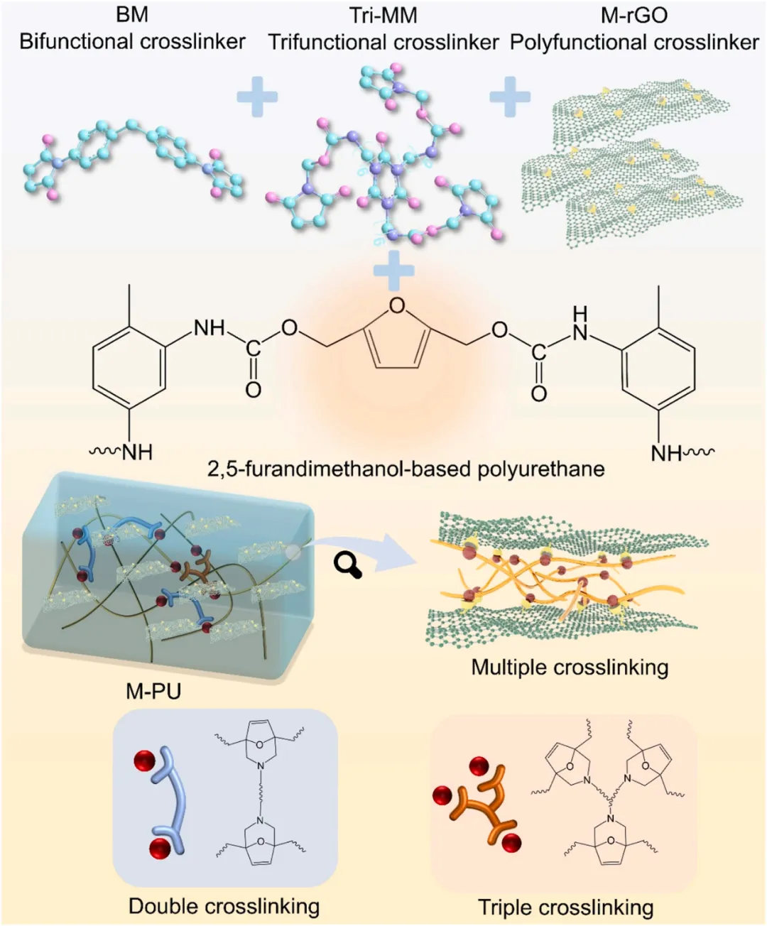 通过系统优化聚氨酯(PU)基体中双交联与三交联网络的比例,成功制得具有最佳韧性的基材,然后引入可多交联的多功能改性石墨烯,获得层级交联聚氨酯复合涂层(M-PU)。 在3.5wt% NaCl溶液中浸泡30天后,该复合涂层的低频阻抗模值比未改性涂层提高了三个数量级,表现出优异的耐腐蚀性。该复合涂层具有优异的机械性能,经48小时空蚀测试后,质量损失减少了50.4%;经24小时摩擦磨损测试后,质量损失减少了64.6%。此外,该复合涂层通过DA键的可逆断裂实现了涂层可回收,首次回收后拉伸应力可达到初始状态的97.6%。因此,本研究不仅为海洋动力部件提供了一种新型多功能防护方案,还为动态交联材料在极端环境中的应用奠定了理论基础。 制备方法及其交联结构 M-PU制备方法及其交联结构。