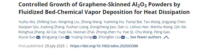 导语 电子设备小型化、高功率化带来的散热难题如何破解?热界面材料(TIM)是关键!北京大学刘忠范院士团队在《Advanced Science》发表创新成果:利用流化床化学气相沉积(FB-CVD)技术,成功为氧化铝(Al₂O₃)粉末披上高质量、连续的石墨烯“外衣”,制备出导热性能大幅跃升的复合粉末及热界面材料。这项技术攻克了高质量石墨烯复合材料可控制备难题,为下一代电子器件散热带来新希望。 研究亮点 1、创新“石墨烯皮肤”: FB-CVD 精准控制,在氧化铝粉末表面生长出高结晶度、高覆盖率、批次稳定的连续石墨烯层(Gr-skinned Al₂O₃)。 2、构建“声子高速通道”: 石墨烯优异特性及其与 Al₂O₃ 的强声子耦合,在复合材料内形成高效热传递网络。石墨烯层热流通量比 Al₂O₃ 内部高出一个数量级! 3、导热性能飞跃: 基于该材料制备的 TIM 导热率高达 6.44 W·m⁻¹·K⁻¹,显著优于传统 Al₂O₃ 基 TIM。 4、散热效果显著: 应用于微型 LED,热点温度直降 17.7 °C,有效提升器件性能和寿命。 5、可扩展平台: FB-CVD 技术为石墨烯包覆陶瓷复合材料提供了稳定、可规模化的制备路径。 图文精要 图1:核心流程与应用 流程: Al₂O₃ 粉末在流化床中被含碳气体包覆石墨烯。 应用: 石墨烯包覆粉体填充聚合物形成 TIM。连续石墨烯层作为“声子快速通道”,高效导热,填平微间隙。 图2:高质量“外衣”证明 SEM/TEM等表征清晰展示:石墨烯层连续、完整、高结晶度地包裹 Al₂O₃ 颗粒,效果均匀可控。 图3 & 4:卓越性能验证 理论模拟 (图3): 揭示石墨烯层如何大幅提升界面热导(Gr/Gr 和 Al₂O₃-O/Gr 界面是关键)。 性能实测 (图4c): 石墨烯包覆 Al₂O₃ TIM 导热率/热阻性能全面碾压传统 Al₂O₃ TIM。 红外热像 (图4d, g): 直观显示使用该 TIM 后,器件表面及热点温度显著降低(降幅 17.7°C),效果震撼。 性能对比 (图4h): 该 TIM 在同类 Al₂O₃ 基材料中导热性能领先。 总结与展望 北大团队这项突破性研究,成功实现了高质量石墨烯包覆氧化铝粉末的规模化可控制备。其构建的“声子高速通道”大幅提升了 TIM 导热性能,为高功率芯片、微型 LED、5G 等领域的散热难题提供了高效解决方案。