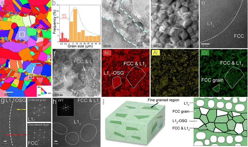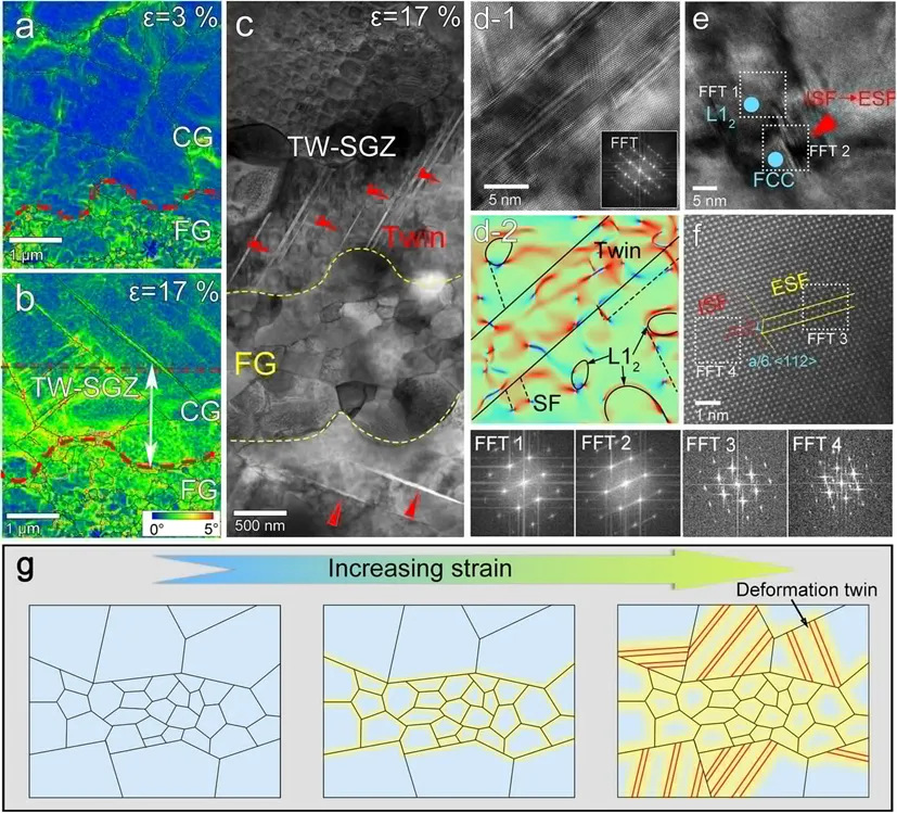 研究团队得到核心设计策略是在合金内部构建分级异质双相结构(HHDP),研究的基体材料为面心立方的Ni38Co25Fe13Cr10Al7Ti7高熵合金。团队通过在粗晶区内引入高密度的L12纳米析出相,同时在晶界区域构筑FCC与L12的超细晶带,这样的微观结构设计特别之处在于,粗晶区能够为材料提供具有高强度的基体,而超细晶带及其与粗晶区之间的异质界面在拉伸过程中产生应变梯度,诱发原本在高层错能材料中难以发生的界面调控形变孪生,这种独特机制赋予材料超高加工硬化能力,从而在高强度下保持塑性稳定性。