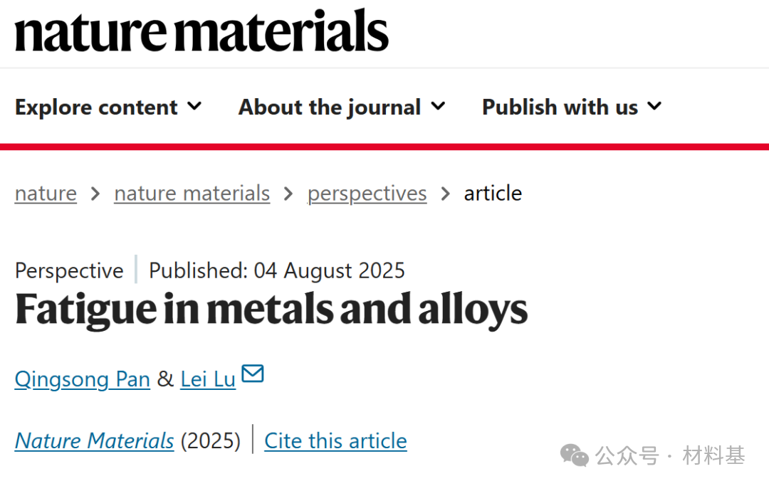 中国科学院金属研究所潘庆松研究员和卢磊研究员应邀在国际顶级期刊《Nature Materials》发表了题为“Fatigue in metals and alloys”的观点文章。该文章系统回顾了金属疲劳循环变形研究的理论框架与发展脉络,提出了应对极端环境下金属及合金材料疲劳失效挑战的系列策略,为未来抗疲劳材料设计提供了重要指导。该观点文章于8月4日在线发表。