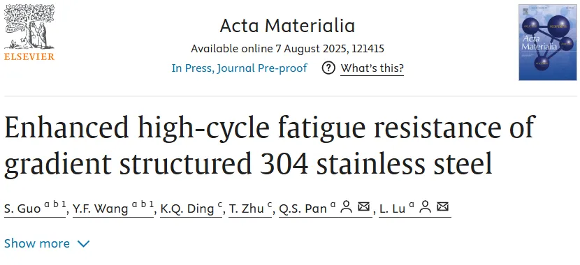 近日中科院金属研究所卢磊研究员团队与佐治亚理工学院合作,在合金中引入了梯度位错胞结构(GDS)以获得优异的强度-延展性组合并提高了304不锈钢的抗疲劳性能。这项研究结果于2025年8月7日被发表在国际期刊《Acta Materialia》上。