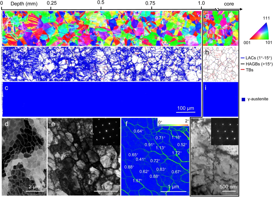 团队通过循环扭转(CT)技术制备了GDS 304 SS,平均晶粒尺寸为40μm,其表层等轴位错胞平均直径约为280nm,取向差0.98°,胞壁位错密度达1.3×1015 m-2,位错胞平均直径随深度增加,在0.5mm深度达到350nm,在2mm深度达到480nm,这一梯度结构有效抑制循环应变局部化,保持结构稳定。