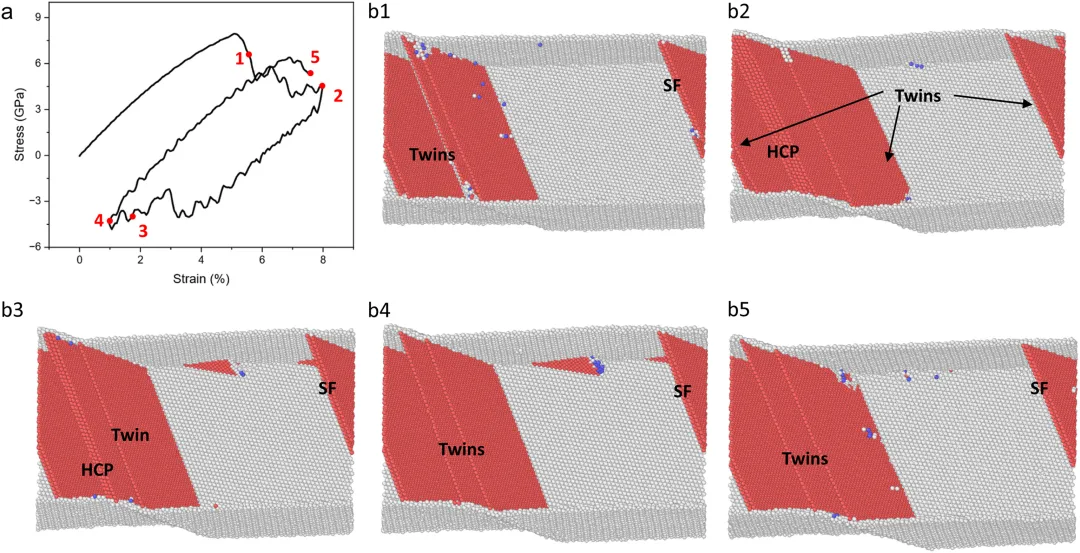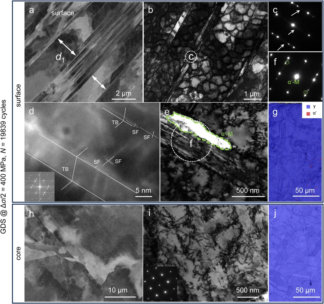高周疲劳下,表层胞壁反复激活部分位错产生堆垛层错(SFs)和形变孪晶(TBs),在胞尺度内实现应变去局域化,显著减轻表面粗化,延缓裂纹萌生。原子模拟揭示SF/TB在加载-卸载过程中的可逆演化与累积硬化作用。