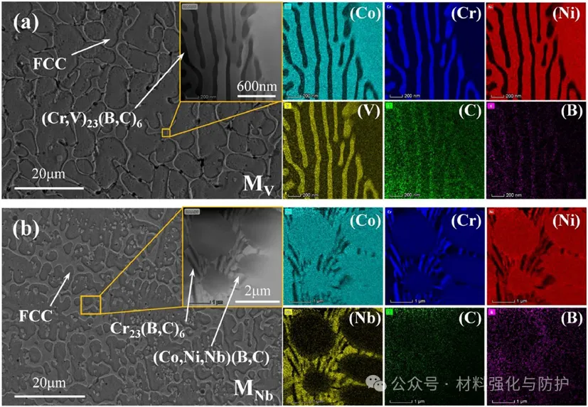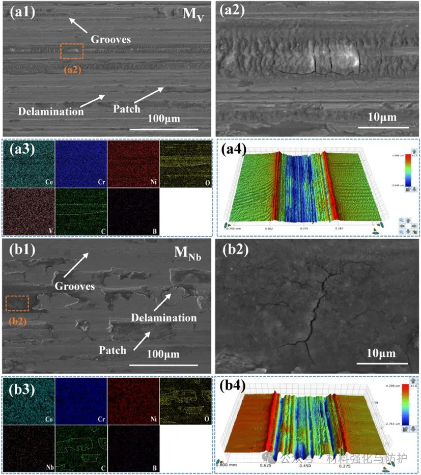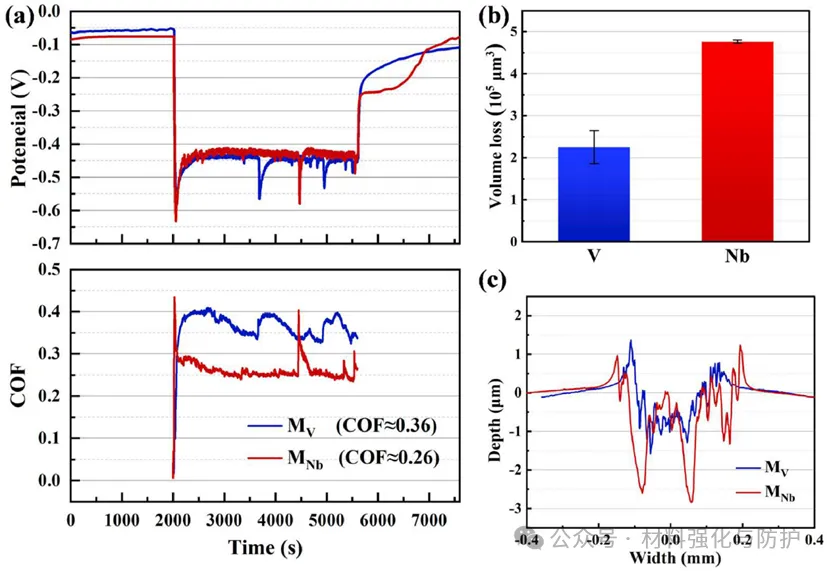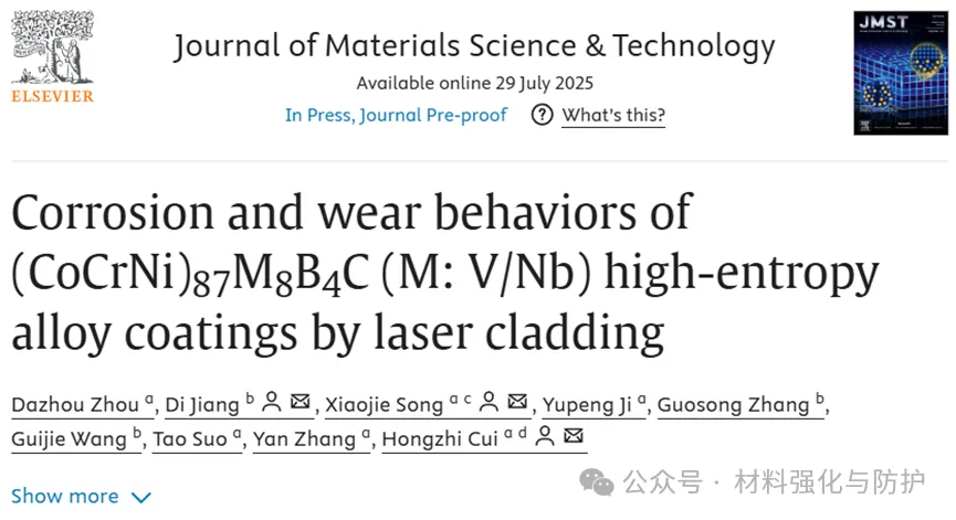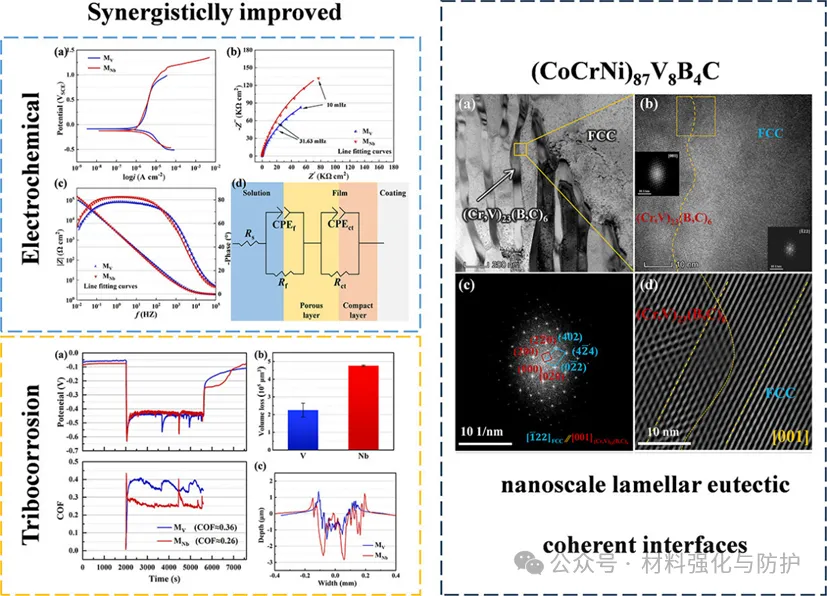 在海洋环境中长期服役的工程应用装备材料经常会承受着磨损和腐蚀的协同作用,导致材料的损伤或者失效,这种磨损和腐蚀的耦合影响远远超过了单个因素对材料的累积效应。因此,耐蚀与耐磨一体化材料的开发对于延长海洋工程系统中材料的使用寿命并确保其安全运行是至关重要的。但传统合金在提高耐磨性和耐腐蚀性的协同方面往往面临着重大挑战,这使工程应用上迫切地需要开发出新型耐磨蚀一体化的材料。 近日,中国海洋大学和山东科技大学的崔洪芝教授团队与中南大学粉末冶金国家重点实验室研究团队通过激光熔覆技术制备出了(CoCrNi)87M8B4C(M: V/Nb)复合涂层,他们通过界面调控结合高熵合金(HEAs)的特征成分,并结合共格界面设计和高固溶度陶瓷增强涂层性能,所制备出的含Nb的涂层磨损率为1.28×104mm3N-1m-1,显著提高了涂层的耐磨性。且两种涂层在腐蚀环境中都可以形成稳定的钝化膜,这为发展耐磨耐蚀材料提供了一种新的策略。该研究结果于2025年6月29日在国际期刊《Journal of Materials Science & Technology》上被接收。 【核心内容】 崔洪芝教授团队采用激光熔覆技术制备出的两种复合涂层同时增强了合金的耐腐蚀性和耐磨性,这种涂层的设计和制备侧重于陶瓷增强相的原位生成、钝化能力和微电偶腐蚀性能。其中含Nb涂层形成双相强化结构,磨损率仅为1.28×104mm3N−1 m−1。在腐蚀方面,含V和含Nb涂层的腐蚀电流密度分别为178nAcm−2和182nAcm−2,腐蚀导致了含Nb涂层在干摩擦和摩擦腐蚀条件下具有不同的磨损机理。 图形摘要 【研究方法】 该研究以CoCrNi体系为基础,采用激光熔覆技术制备(CoCrNi)87M8B4C(M:V/Nb)复合涂层,两种涂层分别命名为MV和MNb,并采用动电位极化(Tafel)、恒电位极化、电化学阻抗谱(EIS)和莫特-肖特基(M-S)分析来评估涂层的电化学行为。另外采用扫描开尔文探针显微镜(SKPFM)分析了不同相的功函数(WFs)特性,从热力学和热力学两个角度分析了涂层的腐蚀机理。 【研究成果】 ① 涂层的微观组织 两种涂层都呈现出了枝晶状微观组织,在相形成方面,MV涂层是由FCC基体相和(Cr,V)23(B,C)6强化相组成,具有纳米级层状共晶结构,层间距约为200nm,而MNb涂层是FCC基体相、Cr23(B,C)6相和(Co,Ni,Nb)(B,C)相的三相共存结构,枝晶间区域呈块状共晶结构,其晶粒尺寸更小且枝晶间区域更大。此外,两种涂层的强化相均与基体形成了良好的界面结合,其中MV中FCC相与(Cr,V)23(B,C)6相存在相干界面,而MNb中存在非晶区域,有效降低了界面能。 涂层的微观结构和EDS谱:(a) MV和(b) MNb 涂层的TEM图像和SAED结果:(a) MV和(b) MNb ② 涂层耐腐蚀性能及其机制 MV和MNb涂层在3.5wt.%NaCl溶液中都可以自发钝化,腐蚀电流密度分别为178和182nA・cm-2且无点蚀现象。其中MNb涂层的耐蚀性更好且钝化膜更厚,具有1.45MV・cm-1的内电场强度,相比于MV的1.02MV・cm-1更高。MNb涂层膜/溶液界面电位差更低,钝化膜溶解速率更慢,表现出更优的耐蚀性。相干相界面和高固溶强化相减少了相间成分差异和电偶腐蚀,促进了均匀钝化膜的形成,低相间电位差和高原子堆积密度进一步抑制了腐蚀的发生。 (a) 动电位极化曲线, (b) 相应的奈奎斯特图, (c) Bode图, (d)等效电路 (a, d) MV和MNb涂层在不同电位下的Mott-Schottky图, (b, e) 施主密度和形成电势之间的关系的曲线, (c, f) 不同电位下的准稳态电流密度 ③ 涂层的耐磨性及其机制 MNb涂层的平均硬度为377HV0.2,与MV涂层的283HV0.2相比更高。MV涂层以粘着磨损为主,表面有明显分层和磨屑堆积,MNb涂层以磨粒磨损为主,表面更光滑,分层区域显著减少。纳米级层状共晶结构缓解了相间应力集中,延迟了磨损过程中表面裂纹的萌生,强化相的均匀分布和界面强结合(相干界面、非晶区域)进一步提升了抗磨损能力。 (a) 沿着涂层深度的显微硬度, (b)磨损率, (c) 磨损截面轮廓, (d)磨损体积损失和磨损率 (a) 摩蚀试验中的OCP和COF, (b) 磨损体积损失, (c) 磨损截面轮廓 磨损形貌及面扫分析 性能对比图 【总结与展望】