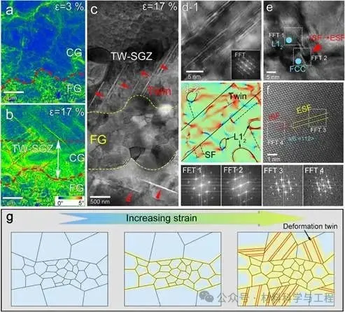 图3. HHDP合金的微观变形机制:a, b 分别在3%和17%拉伸应变下变形样品的EBSD图像;c 在17%拉伸应变下的变形样品的TEM图像,显示了在粗晶和超细晶界面附近的应变梯度区(TW-SGZ) 中变形孪晶的形成;d, e HR-TEM 图像和来自形变孪晶的几何相分析(GPA)图;f 显示从ISF到ESF转变的HR-TEM图像;g HR-STEM图像说明了a/6<112>型滑移位错的相互作用,通过在(111)面上的连续滑移,触发了ESF的形成;h 随着应变增加显微结构演变的示意图