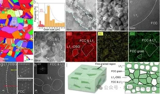 图1. 合金的层状异质结构(HHDP)显微组织:a EBSD反极图(IPF)显示了层状异质晶粒结构,包括粗晶粒和超细晶粒区域;b 粒度分布的直方图;c 粗晶和超细晶区域的HAADF STEM图像;d, e 粗晶区域的HAADF-STEM和HR-STEM图像,证明了FCC晶粒内相干L12纳米颗粒的均匀沉淀;f 超细晶区域的HAADF-STEM和EDS图像,显示了三种类型的超细晶粒:L12有序晶粒、包含L12纳米颗粒的FCC晶粒和没有析出相的FCC晶粒;g L12有序超细晶粒的HR-STEM图像,以晶界处无序的晶粒间纳米层为特征;h 包含L12纳米颗粒的超细FCC颗粒的HR-STEM图像;I HHDP合金独特微观结构的示意图