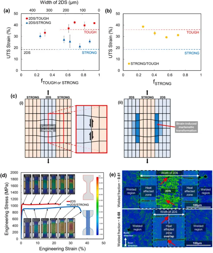 图5.(a)极限拉伸强度下的应变,或UTS应变(即颈缩的开始)与2DS/STRONG和2D/坚韧的焊接宏观相的体积分数的关系。(b)STRONG/坚韧的UTS应变与STRONG的体积分数的关系曲线。虚线表示各个2DS的UTS应变,(c)说明在过早应变局部化的情况下,STRONG和2DS宏观相之间的相互稳定的示意图:(i)随着屈服下降,2DS中的应变局部化被相邻的强宏观相阻止。箭头表示与2DS中的局部变形相反的剪切力。(ii)在较高应变下,强宏观相中的局部颈缩被2DS中的应变诱导马氏体相变稳定,这提高了局部加工硬化速率。(d)2DS和2DS/STRONG的工程应力-应变曲线,以及不同应变间隔的DIC快照。(e)具有不同焊缝分数的两个2DS/坚韧样品的EBSD KAM图(0.61和0.68)。焊缝分数为0.61的样品中的2DS经历部分再结晶和回复,而焊接分数为0.68的样品中的2DS完全在热影响区(HAZ)内。红色箭头指向2DS宏观相中未焊接的层间间隙。