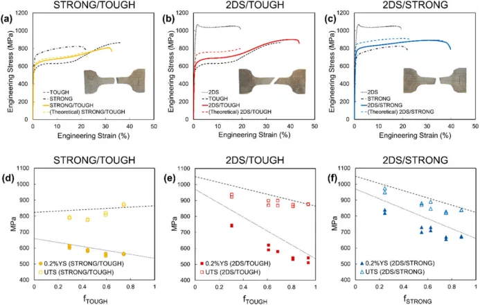 = 0.63)异金属。理论曲线基于混合规则计算(方程(2)).(d,e,f)超金属样品的面内0.2%YS和UTS与宏观相分数(f)的关系。
