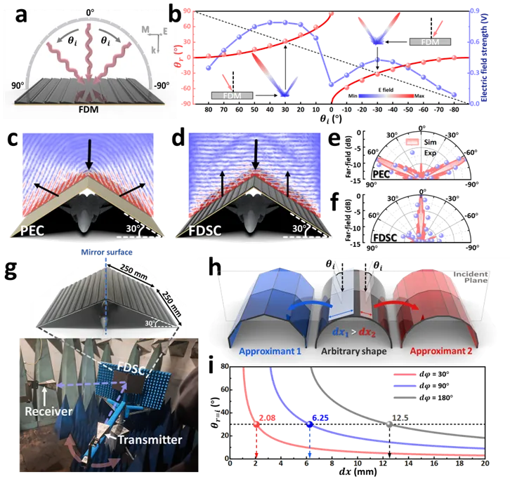 人工电磁超材料凭借其精密几何结构对电磁波的调控能力,可实现传播路径、相位及幅度等的精确操控,在国防安全领域具有重大战略意义。然而,传统基于谐振结构单元的隐身超材料,其电磁响应受限于单元面内尺寸与工作波长的固有耦合关系,导致单元难以小型化,并在相位调控精度与工作带宽等方面存在固有局限,严重制约了其在紧凑型平台上的隐身应用。 本研究提出一种无谐振结构超材料设计,利用铁磁介质单元中的纵向多层干涉效应调控反射波,有效解耦了单元面内尺寸对电磁响应的约束,实现了跨尺度下的自由相位梯度设计。该设计不仅为电磁波操控提供了前所未有的灵活性,更通过将反射波转化为沿超材料表面水平传播的表面波,开创了一种全新的强制微波能量耗散机制。实验与仿真结果(图1)表明,当样品覆盖的相位周期数达到10时,垂直入射背景下的反射波可被完全转化为沿超材料界面传播的表面波。该表面波在水平传播过程中强制性地被具有本征损耗特性的铁磁介质二次吸收,使得材料内部的平均功率损耗密度提升了36.64%,最低反射损耗达到-52 dB,有效吸收带宽为7.4 GHz。 图1 通过诱导表面波提高超材料的电磁损耗效率和反射损耗性能 利用斜入射下的特殊散射场分布,进一步验证了铁磁介质基超材料在构建隐形斗篷中的应用潜力(图2)。该斗篷能够在均匀回波背景下有效隐藏目标的几何形状特征,提供了一种高效的隐身新方案。由于消除了电磁响应对谐振结构尺寸的依赖性,本研究提出了一种适用于曲面共形的“渐变尺寸单元”设计方法并基于此方法开发了铁磁介质基超材料曲形隐形斗篷,将曲形目标产生的弯曲波阵面重构为平面波阵面。在相位梯度恒定的条件下,该设计方法仅需调控单元尺寸即可精确控制反射波角度,有效解决了曲形目标的相位补偿难题。 图2 斜入射下的散射场分布以及铁磁介质基隐身斗篷的设计示意图 AM论文第一作者是材料学院博士生陈伟,AFM第一作者是材料学院硕士生李泽瑞,通讯作者为材料学院段玉平教授。研究工作得到了国家自然科学基金项目和中央高校基本科研业务费的资助支持。