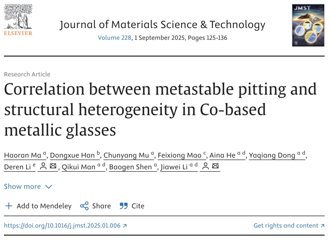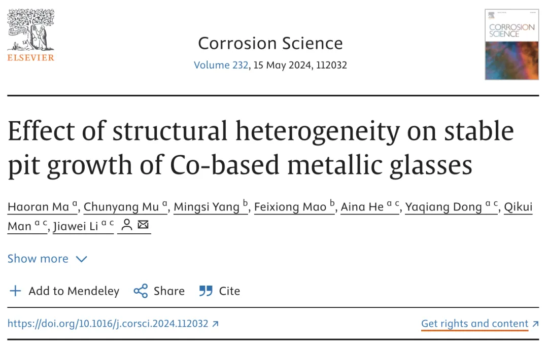 钴基非晶软磁材料具有超高的磁导率、极低的功耗等特性,广泛应用于弱磁传感器、精密测量设备及电磁防护等领域。但非晶软磁材料在含氯离子的环境中易诱发点蚀,制约其在海洋等极端环境领域的应用。 值得注意的是,非晶软磁材料是非晶合金的重要分支,其腐蚀行为也需在更广泛的非晶合金研究框架下理解。目前,有关非晶合金点蚀的研究都使用一维尺寸在毫米级以上的常规电极。大面积的电极表面往往同时发生多个点蚀,导致信号相互重叠而难以区分。因此,常规电极表征的是电极表面整体的统计结果,难以获得点蚀生长的详细信息。此外,非晶合金的结构长程无序,其结构与性能的关联性一直是研究的难点。因此,有关非晶合金本征结构与点蚀生长的关联性,科学界长期缺乏系统性认知。 针对该问题,中国科学院宁波材料技术与工程研究所软磁材料及其应用技术团队采用微米级直径的钴基非晶合金丝作为微电极,成功实现对单个点蚀生长动力学过程的定量评价,包括亚稳态点蚀的生长和稳态转变的临界条件、以及稳态点蚀生长的扩散传质和活化溶解过程,首次揭示了非晶结构不均匀性对亚稳态点蚀和稳态点蚀这两个点蚀生长关键阶段的影响机制。研究发现: (1)热诱导的结构均质化抑制了亚稳态点蚀的诱发频率,减缓亚稳点蚀的生长速率,同时加速点蚀的再钝化速率,并降低亚稳点蚀向稳态点蚀的转变概率;点蚀抗性的提高得益于非晶结构均质化导致的点蚀前驱体活性位点的减少和电化学活性的降低。 (2)热诱导的结构均质化提高了再钝化电位和维持点蚀稳态生长所需的蚀坑临界溶液浓度,显著抑制无盐膜覆盖条件下活化控制的点蚀稳态生长;非晶合金结构不均匀性的改变不影响盐膜沉淀要求的蚀坑溶液饱和浓度,因而对盐膜覆盖条件下扩散控制的点蚀稳态生长的抑制作用相对微弱。 上述工作为设计极端环境用非晶软磁材料提供理论指导。基于上述成果,团队开发出兼具优异软磁性能与高耐蚀性能的新型钴基非晶软磁材料,满足了海洋极端环境下的服役要求,为多种装备的弱磁探测和电磁防护提供了有力支撑。 图1 退火弛豫引起的结构均质化,提高钴基非晶软磁合金的点蚀抗性 图2 钴基非晶丝微电极表征亚稳态点蚀和稳态点蚀 图3 结构不均匀性对钴基非晶软磁合金点蚀生长的影响机制 相关成果 Corrosion Science Effect of structural heterogeneity on stable pit growth of Co-based metallic glasses DOI: 10.1016/j.corsci.2024.112032 Journal of Materials Science & Technology Correlation between metastable pitting and structural heterogeneity in Co-based metallic glasses DOI: 10.1016/j.jmst.2025.01.006
