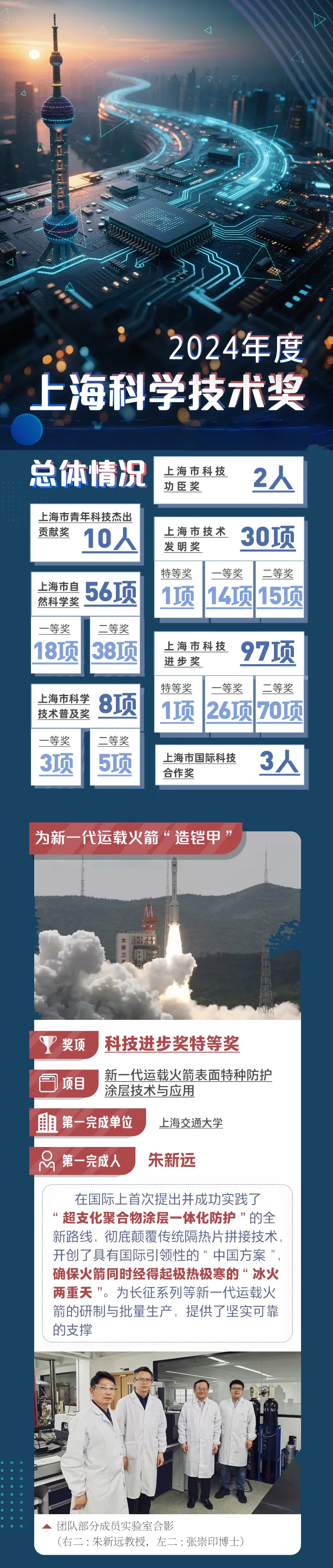 8月26日,上海市科学技术奖励大会举行,2024年度上海市科学技术奖授奖206项(人)。上海交通大学化学化工学院朱新远教授牵头的项目“新一代运载火箭表面特种防护涂层技术与应用”荣获科技进步奖特等奖。这项突破性的成果,在航天防护涂层领域实现了质的飞跃。团队在国际上首次提出并成功实践了“超支化聚合物涂层一体化防护”的全新路线,彻底颠覆了传统隔热片拼接技术,开创了具有国际引领性的“中国方案”,为长征系列等新一代运载火箭的研制与批量生产,提供了坚实可靠的支撑。 项目介绍 在探索浩瀚宇宙的征途上,新一代运载火箭肩负着艰巨使命。它们对覆盖全身的“防护铠甲”——表面防护材料,提出了苛刻的要求:必须高可靠、高效率!其中,火箭卫星整流罩和低温燃料贮箱是防护体系的关键,面临着严苛的考验:位于火箭头部的卫星整流罩在穿越大气层时,需承受500℃以上高温气流的猛烈冲刷;而低温燃料贮箱则需耐受液氧带来的-183℃极端低温冲击。传统的隔热结构拼接技术,存在大量的拼接界面,可靠性不高、制造周期长,难以满足新一代火箭高可靠、快节奏发射的迫切需求。 抢占太空轨道高地: 火箭高频发射,国之重器刻不容缓 为何火箭需要如此频繁地升空?关键在于稀缺的太空轨道资源!根据国际电信联盟(ITU)制定的“先登先占、先占永得”原则,卫星环绕地球运行的轨道如同太空中的“黄金地段”,申请后必须在规定年限内完成整个卫星的发射,否则宝贵的轨道使用权将自动失效。这意味着运载火箭的年发射量必须从当前的60多发,后续将急速跃升。高可靠、高效率、低成本的火箭发射能力,已然上升为国家需求!然而,这条通天之路布满荆棘。在长达七十多年的技术发展中,现实告诉我们:关键航天技术与材料“要不来、买不来、讨不来”,唯有依靠自主创新,走科技自立自强之路! “冰火两重天”淬炼: 新一代火箭表面防护面临严峻挑战 披覆在火箭表面的高分子防护层,是守护火箭安全升空的关键“屏障”。然而,卫星整流罩和低温燃料贮箱这两大“要塞”,服役环境严苛: 卫星整流罩:烈焰焚身! 它位于火箭最前端,当火箭高速穿越稠密大气时,表面温度瞬间飙升至500℃以上。如此高温下,构成火箭主体的铝合金和复合材料的强度会急剧下降,舱内精密的仪器设备也会因高温“罢工”。因此,必须给整流罩披上高效的“隔热斗篷”。国内外普遍采用手工粘贴防热软木片的方案,这种方案工艺繁琐、效率较低,质量难以精确控制。此外,软木片容易吸湿“鼓包”、“脱粘”,返修率很高!这些问题如同悬在头上的“达摩克利斯之剑”,严重威胁着火箭和卫星的安全。 美国space-X猎鹰九号 低温燃料贮箱:冰封刺骨! 新一代火箭采用液氧等超低温燃料。燃料加注后,贮箱壁温度骤降至-183℃。传统贮箱采用的多层包覆防护技术不仅重量大、结构复杂,同样面临易脱粘分层的困境。为了克服上述问题,新型号火箭设计中取消了绝热层,尝试将防护涂层直接喷涂在冰冷的金属舱壁上。但普通防护涂层在如此极寒下会变得脆如薄冰,极易开裂、剥落失效,丧失保护作用。 上述“冰火交织”的严峻挑战,不仅时刻威胁着火箭和卫星的安全,更成为了制约火箭高频次发射的瓶颈,一场防护技术的革命迫在眉睫! 基础与工程的“火花碰撞”: 勇闯航天材料“无人区” 故事的转折点,源于一次深思熟虑的“跨界”碰撞。上海交通大学朱新远教授团队,长期深耕于聚合物合成的科学前沿。该团队由我国著名高分子化学家颜德岳院士奠基,如今颜院士仍担任团队顾问。早在2009年,朱新远教授团队就取得了一项重要突破——发明了杂化聚合制备超支化聚合物的新方法。朱教授敏锐地洞察到这项技术的巨大潜力,并前瞻性地探索其在航天工程领域的应用可能性,但当时苦于没有具体的工程需求牵引。 与此同时,一位交大学子正投身于航天的星辰大海。2013年,张崇印博士怀揣航天报国的赤子之心,从上海交大毕业,加入了我国运载火箭两大总装基地之一的上海航天设备制造总厂有限公司。此时恰逢新一代运载火箭研制的关键时期,张博士凭借着出色的技术攻关能力,在2015年开始负责上海航天设备制造总厂有限公司新一代火箭高分子防护材料的研制工作。面对整流罩和贮箱的防护难题,攻关团队一度陷入困境,举步维艰。 就在这时,师生情缘与家国使命产生了奇妙的化学反应!朱新远教授找到了张崇印博士,表达了将前沿的超支化聚合物技术应用于解决火箭防护难题的合作意愿。师生两人一拍即合! 他们迅速联合上海宇航系统工程研究所等航天核心单位,组建了一支产学研用深度融合的攻关团队。 上海市科学技术委员会高度重视航天材料研发,在其推动下,2018年,一个重要的平台诞生——上海航天特种环境高分子功能材料工程技术研究中心正式获得批复。该中心汇聚了高分子功能材料领域的顶尖智慧:由四川大学王琪院士、上海交通大学颜德岳院士、东华大学朱美芳院士、上海交通大学朱新远教授和航天材料及工艺研究所卢鹉研究员等专家担任技术委员会委员,张崇印博士出任中心主任,形成了“基础研究源头创新-核心技术攻关-工程化应用”的完整闭环创新链条。在这个体系中,上海交通大学潜心基础技术研究和新材料开发;上海宇航系统工程研究所聚焦航天器的热环