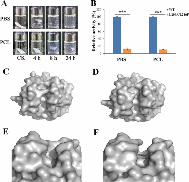 图4 野生型AaCut10与其突变体L209A/L216F的降解速率比较和结构预测