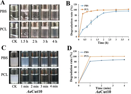 图3 海洋真菌Alternaria alternata FB1角质酶AaCut10对PBS和PCL的降解效果