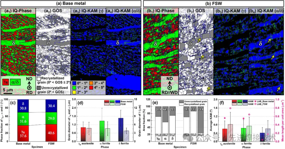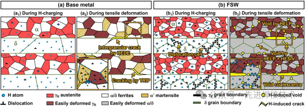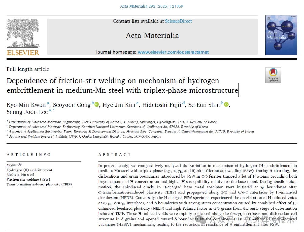 2025年4月,Tech University of Korea (TU Korea)的Kyo-Min Kwon等人在《Acta Materialia》上发表了《Dependence of friction-stir welding on mechanism of hydrogenembrittlement in medium-Mn steel with triplex-phase microstructure(搅拌摩擦焊对中锰钢氢脆机制影响-基于三相组织微结构的演化与氢行为分析)》一文。 研究背景 中锰钢(Medium-Mn Steel)由于具备良好的强韧性匹配、加工性以及成本优势,近年来在汽车轻量化、高强结构件中受到广泛关注。特别是三相组织(铁素体+马氏体+残余奥氏体)中锰钢,因其具备稳定的力学性能与氢扩散行为调控潜力,被视为抗氢脆候选材料之一。 氢脆(Hydrogen Embrittlement, HE)作为高强钢常见失效机制,其微观机制受到材料组织、位错密度、界面性质及氢陷阱行为的耦合影响。焊接过程中,热输入不仅引起材料组织变化,还可能改变氢在材料中的分布与陷阱状态,进而影响氢脆敏感性。 传统熔化焊热影响区(HAZ)组织严重变化、氢易聚集,造成抗氢脆性能下降。相比之下,搅拌摩擦焊(Friction Stir Welding, FSW)作为一种固态连接方法,可在低热输入下连接中高强钢,具有显著组织细化效应,并可抑制氢浓缩,为提升抗氢脆性能提供可能。因此,明确FSW在不同微区对氢行为及脆化机制的影响规律,对高强中锰钢焊接结构的服役可靠性提升具有重要意义。 试验方法 本文采用中锰三相组织钢(含10.6%Mn,1.1%Al,0.2%C),通过热处理获得兼具马氏体+铁素体+残余奥氏体的初始组织。采用常规FSW工艺(工具转速400 rpm,焊接速率100 mm/min)制备对接接头,并划分焊缝为三个区域:Base Material (BM)-母材;Thermo-Mechanically Affected Zone (TMAZ)-热-机械影响区;Stir Zone (SZ)-搅拌区。 随后,分别对不同区域进行以下表征与分析:EBSD观察组织演化;SIMS分析氢分布;热脱附(TDA)与应力腐蚀试验分析氢陷阱与断裂行为;数值建模估算氢扩散行为与应力分布。 研究结果与分析 1. 微观组织演化:强烈组织细化与相变行为 母材组织由较粗的马氏体+铁素体+残余奥氏体组成。FSW后:SZ区域出现极显著的晶粒细化(平均粒径~1.3 μm),同时残余奥氏体含量显著减少;TMAZ区域则保留部分奥氏体,组织呈现不均匀混合状态;EBSD显示,FSW诱发大量高角度晶界(HAGBs),有利于扩散但也可成为氢陷阱。 图1. Fe-8Mn-0.2C-3Al-1.3Si(质量分数)钢中母材与FSW焊缝样品的EBSD结果:(a1 与 b1) IQ-相图;(a2 与 b2) GOS图;(a3 与 b3) γR残余奥氏体的IQ-KAM图;(a4 与 b4) α/δ铁素体的IQ-KAM图。(c) 晶粒尺寸分布,(d) 各相比例,(e) 动态再结晶/未再结晶晶粒比例,(f) 平均KAM值与单位面积低角度晶界(LABs, 2° ≤ θ ≤ 15°)总长度(μm⁻¹)的变化情况。在IQ-相图/GOS图中,黑色和蓝色线分别表示高角度晶界(θ > 15°)与低角度晶界(LABs);黄色箭头标示位错胞(dislocation cell)。ND:法向方向;RD:轧制方向;WD:焊接方向。 2. 氢浓度与分布:SZ区氢含量显著降低 通过二次离子质谱(SIMS)分析可得:氢在母材与TMAZ区域集中显著,在SZ区域则几乎检测不到高氢含量;TDA结果表明:SZ区域的高温脱附峰显著减少,说明FSW抑制了深陷阱的生成(如马氏体位错网络与奥氏体-马氏体界面)。 这一变化表明:组织细化与奥氏体减少,使氢陷阱减少,氢更难富集于SZ区域,从而提升抗氢脆性能。 图2在5、10和20℃/min的加热速率下,充氢(a1)基体和(b1)FSW试样的H解吸速率曲线◦C分钟-1。(a2和b2)加热速率为20℃/min时H解吸速率曲线的峰值分离,(a3和b3)作为加热速率函数的第一和第二峰的Kissinger图,以及(C)加热速率为20℃/min时,图2a2和b2中H解吸速率曲线中每个捕获位点的H含量 3. 力学与断裂行为:FSW显著改善氢致断裂韧性 母材在氢环境中表现出典型的脆性断裂行为,断口呈现准解理特征;而SZ区域在氢充入后仍表现出高的延展性与韧性,断口以韧窝为主;断裂多发生在TMAZ区域,成为潜在弱区,推测与氢局部富集及应力集中有关。 数值模拟也验证了该结果:TMAZ区域应力集中严重,氢扩散梯度最大,结合氢陷阱分布最可能导致氢脆失效。 图3 SSRT后(a1,2和b1,2)H-不带电和(c1,2和d1,2)H-charged试样的整体断裂面和放大图像:(a和c)基体金属和(b和d)FSW试样。ND:法线方向,TD:横向,WD:焊接方向,TA:拉伸轴 图4 具有多相组织的中锰钢在充氢过程中H扩散和捕获的(a1和b1)行为以及拉伸变形过程中H脆化的(a2和b2)断裂行为和相关机制的示意图:充氢(a1和a2)母材和(b1和b2)FSW试样,HEDE:H-增强脱粘,HELP:H-增强定位塑性,HESIV:H-增强应变诱导空位 主要结论 本研究系统探究了FSW对中锰三相钢氢脆敏感性及其机制的影响,结论如下: FSW可显著细化焊缝组织,降低RA含量,有效抑制氢陷阱形成;搅拌区(SZ)氢浓度最低,断裂韧性最高,表现出优异抗氢脆性能;TMAZ成为氢诱导失效的敏感区,需重点优化工艺或后处理;提出“区域化氢脆机制模型”,为多相高强钢焊接设计提供新理论基础; FSW为连接高强钢构件提供了一种低氢脆风险的新型工艺路径,尤其适用于对服役可靠性要求极高的结构件。