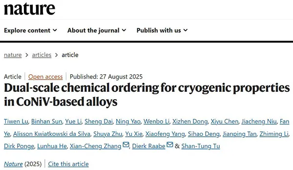 相关研究成果以“Dual-scale chemical ordering for cryogenic properties in CoNiV-based alloys”为题发表在Nature上。