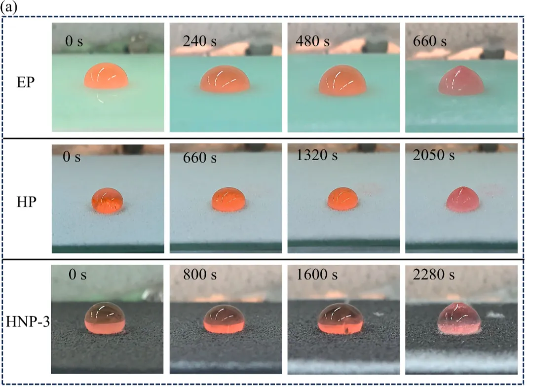 冰滴融化照片 EP、HP和HNP-3表面50μL冰滴在-10℃、1000W·m−2光照强度下融化的照片。