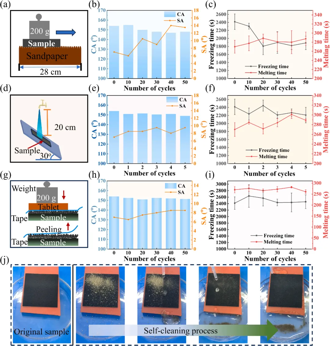 实验数据 (a)砂纸磨损试验示意图;(b)HNP-3砂纸磨损前后的CA和SA;(c)HNP-3 砂纸磨损前后的防/除冰时间;(d)水冲击示意图;(e)HNP-3水冲击前后的 CA 和 SA;(f)HNP-3 水冲击前后的防/除冰时间;(g)胶带剥离示意图;(h)HNP-3 胶带剥离前后的 CA 和 SA;(i)HNP-3胶带剥离前后的防/除冰时间;(j)HNP-3自清洁过程的光学图像。