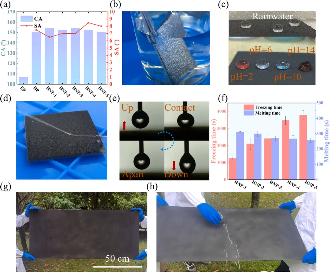 实验现象 (a)EP、HP以及不同厚度的HNP的CA和SA;(b)HNP-3的银镜现象;(c)HNP-3表面不同液滴的光学图像;(d)HNP-3表面水流的反射图像;(e)HNP-3表面水滴粘附动力学测量图像;(f)-10°C下不同厚度HNP的结冰时间和在-10°C + 1000W·m−2光照强度下的除冰时间;(g)大面积喷涂HNP涂层的光学图像;(h)大面积喷涂的HNP涂层的疏水性能展示。