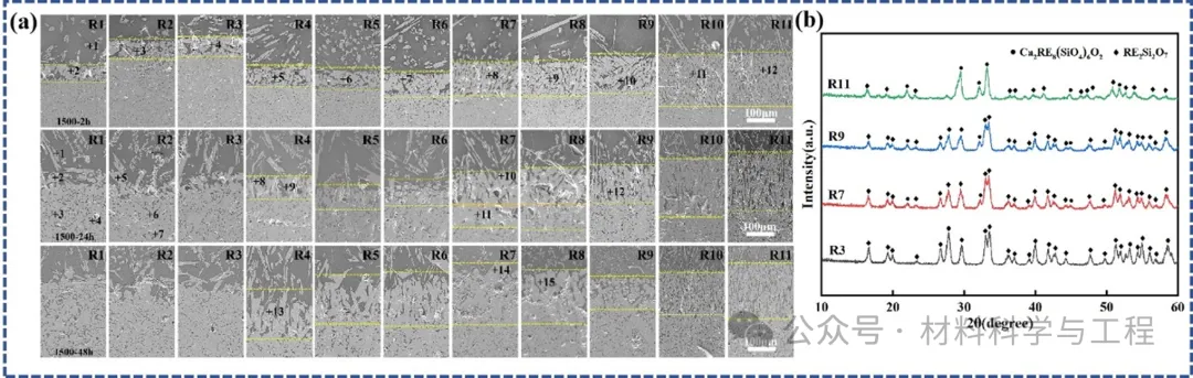 图3陶瓷1500°C耐腐蚀性能:(a) ((5RExi)2Si2O7)陶瓷在1500 ℃下经CMAS腐蚀2 h、24 h和48 h的腐蚀截面图;(b) R3、R7、R9和R11陶瓷试样在1500 ℃下经CMAS腐蚀24 h后的XRD图。