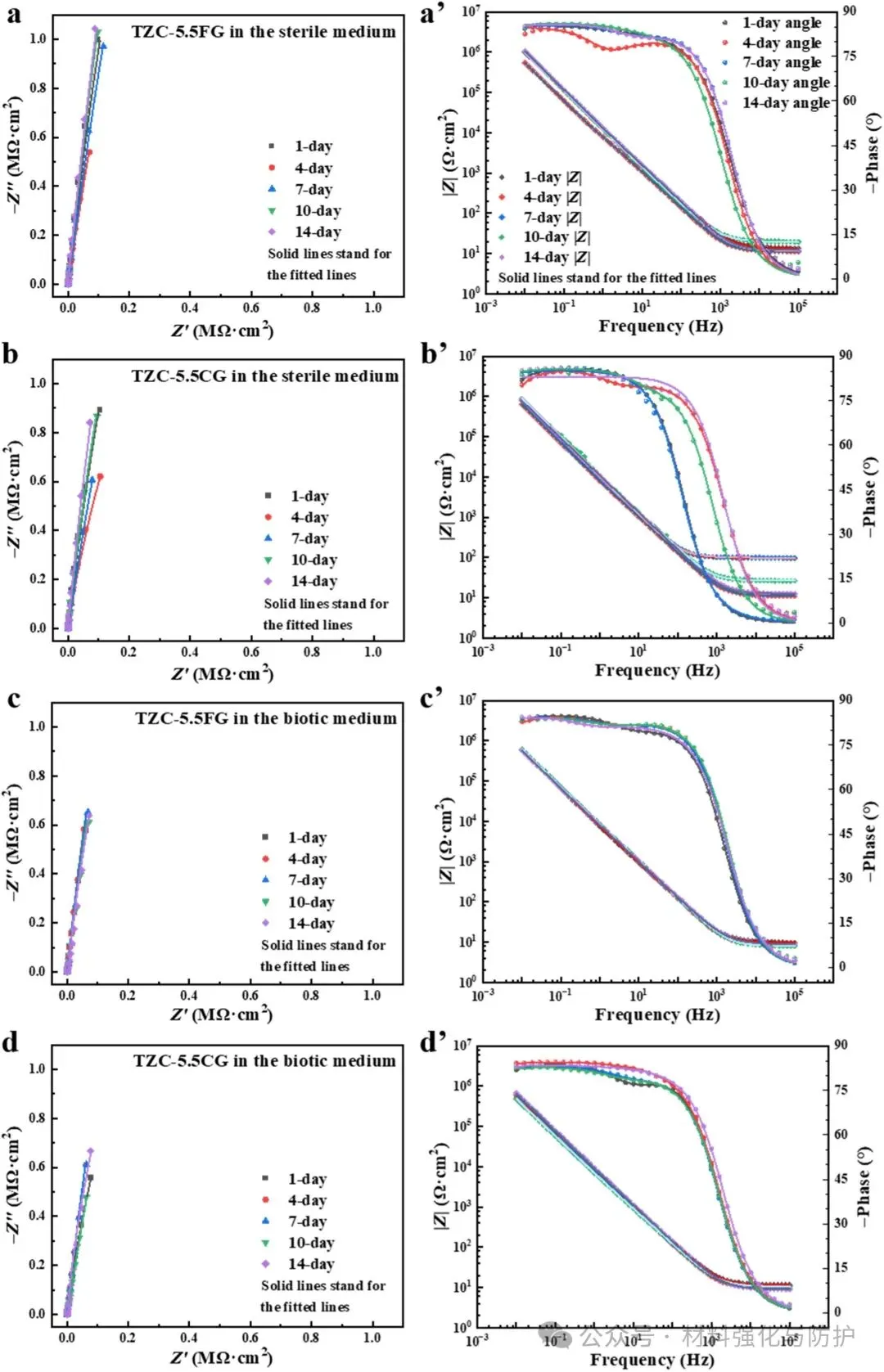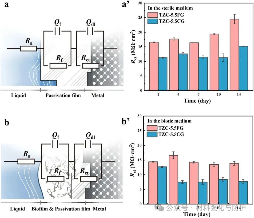 等效电路原理图和Rct在(a, a’)无菌和(b, b’)生物培养基中浸泡14天后的变化