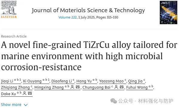 为应对这一挑战,东北大学徐大可教授和联合中科院金属所柏春光研究员团队,设计并开发出一种细晶TiZrCu合金,在保障力学性能的同时,实现了对海洋MIC环境的优异耐受性,联合团队将相关成果发表于《Journal of Materials Science & Technology》。