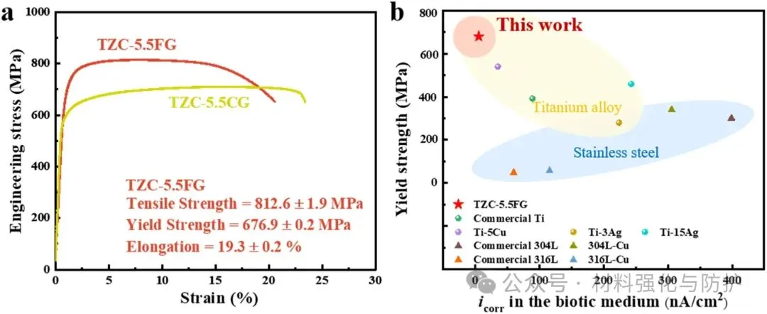 (a) TZC-5.5合金的工程应力-应变曲线;(b) 与其他商用合金相比,TZC-5.5FG合金的耐MIC性能与屈服强度水平图谱