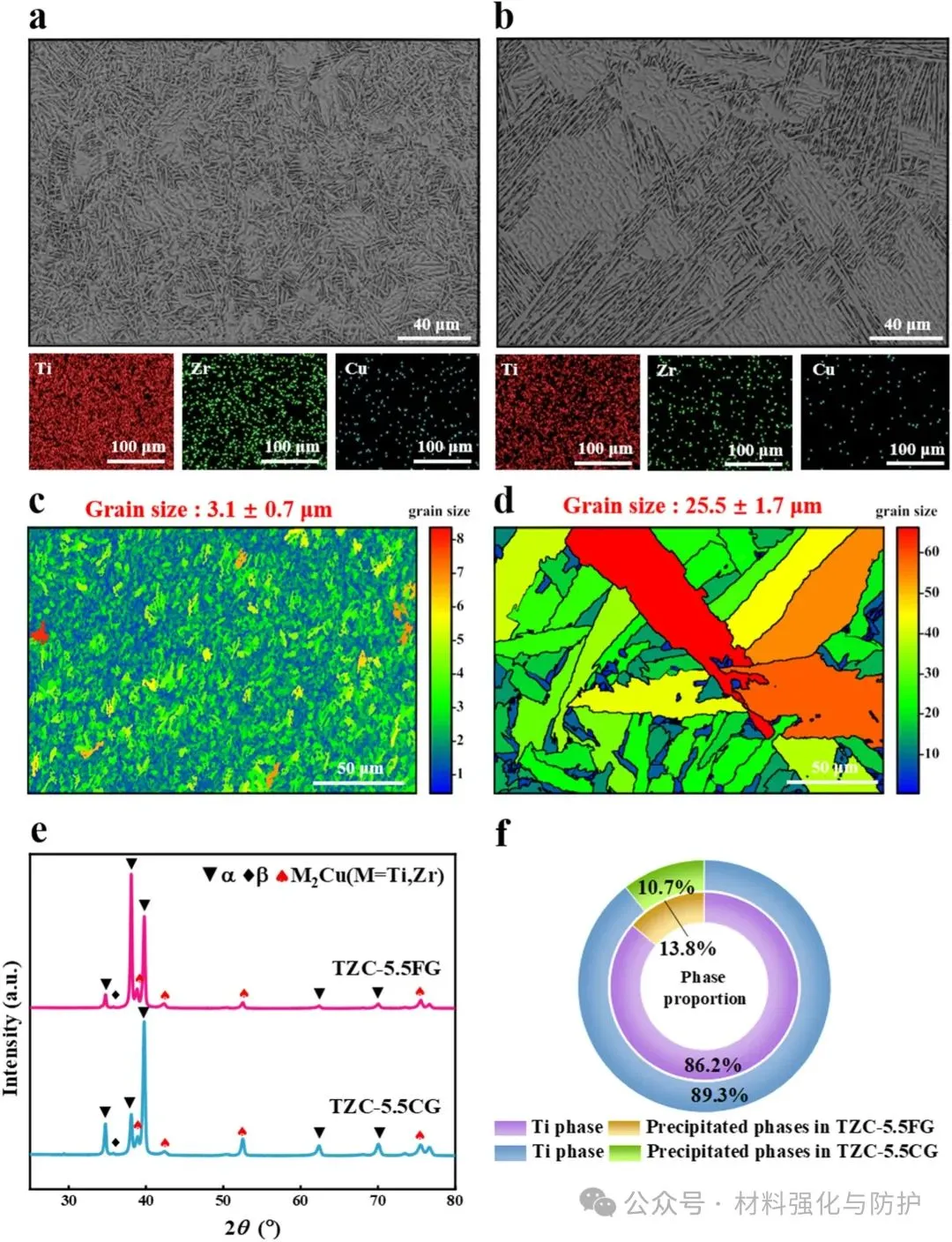 与传统纯钛或TiCu合金相比,TiZrCu合金中通过Zr固溶与Cu局部偏聚形成更均匀的细晶组织,晶粒细化提高了TZC-5.5合金的抗MIC性能,TZC-5.5CG和TZC-5.5FG合金的晶粒尺寸分别为25.5±1.7μm和3.1±0.7μm,组织稳定性强,抑制晶界腐蚀萌生。